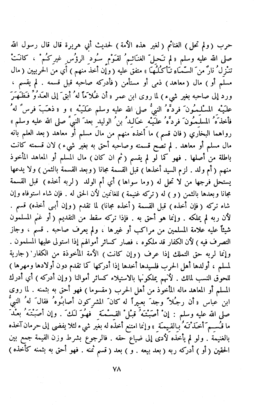 حَرْبٍ (وَلَمْ تَحِلَّ) الْغَنَائِمُ (لِغَيْرِ هَذِهِ الْأُمَّةِ) لِحَدِيثِ أَبِي هُرَيْرَةَ قَالَ قَالَ رَسُولُ اللَّهِ - صَلَّى اللَّهُ عَلَيْهِ وَسَلَّمَ - «لَمْ تَحِلَّ الْغَنَائِمُ لِقَوْمٍ سُودِ الرُّءُوسِ غَيْرِكُمْ، كَانَتْ تَنْزِلُ نَارٌ مِنْ السَّمَاءِ تَأْكُلُهَا» مُتَّفَقٌ عَلَيْهِ.