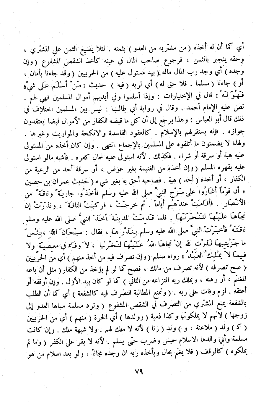 (وَإِنْ أَخَذَهُ مِنْ الْغَنِيمَةِ بِغَيْرِ عِوَضٍ أَوْ سَرَقَهُ أَحَدٌ مِنْ الرَّعِيَّةِ مِنْ الْكُفَّارِ أَوْ أَخَذَهُ) أَحَدٌ (هِبَةً فَصَاحِبُهُ أَحَقُّ بِهِ بِغَيْرِ شَيْءٍ) لِحَدِيثِ عِمْرَانَ بْنِ حُصَيْنٍ «أَنَّ قَوْمًا أَغَارُوا عَلَى سَرْحِ النَّبِيِّ - صَلَّى اللَّهُ عَلَيْهِ وَسَلَّمَ - فَأَخَذُوا جَارِيَةً وَنَاقَةً مِنْ الْأَنْصَارِ فَأَقَامَتْ عِنْدَهُمْ أَيَّامًا، ثُمَّ خَرَجَتْ، فَرَكِبَتْ النَّاقَةَ، وَنَذَرَتْ إنْ نَجَّاهَا عَلَيْهَا لَتَنْحَرَنَّهَا، فَلَمَّا قَدِمَتْ الْمَدِينَةَ أَخَذَ النَّبِيُّ - صَلَّى اللَّهُ عَلَيْهِ وَسَلَّمَ - نَاقَتَهُ فَأَخْبَرَتْ النَّبِيَّ - صَلَّى اللَّهُ عَلَيْهِ وَسَلَّمَ - بِنَذْرِهَا، فَقَالَ: سُبْحَانَ اللَّهِ، بِئْسَ مَا جَزَيْتِيهَا نَذَرْتِ لِلَّهِ إنْ نَجَّاهَا اللَّهُ عَلَيْهَا لَتَنْحَرَنَّهَا، لَا وَفَاءَ فِي مَعْصِيَةٍ وَلَا فِيمَا لَا يَمْلِكُ الْعَبْدُ» رَوَاهُ مُسْلِمٌ.