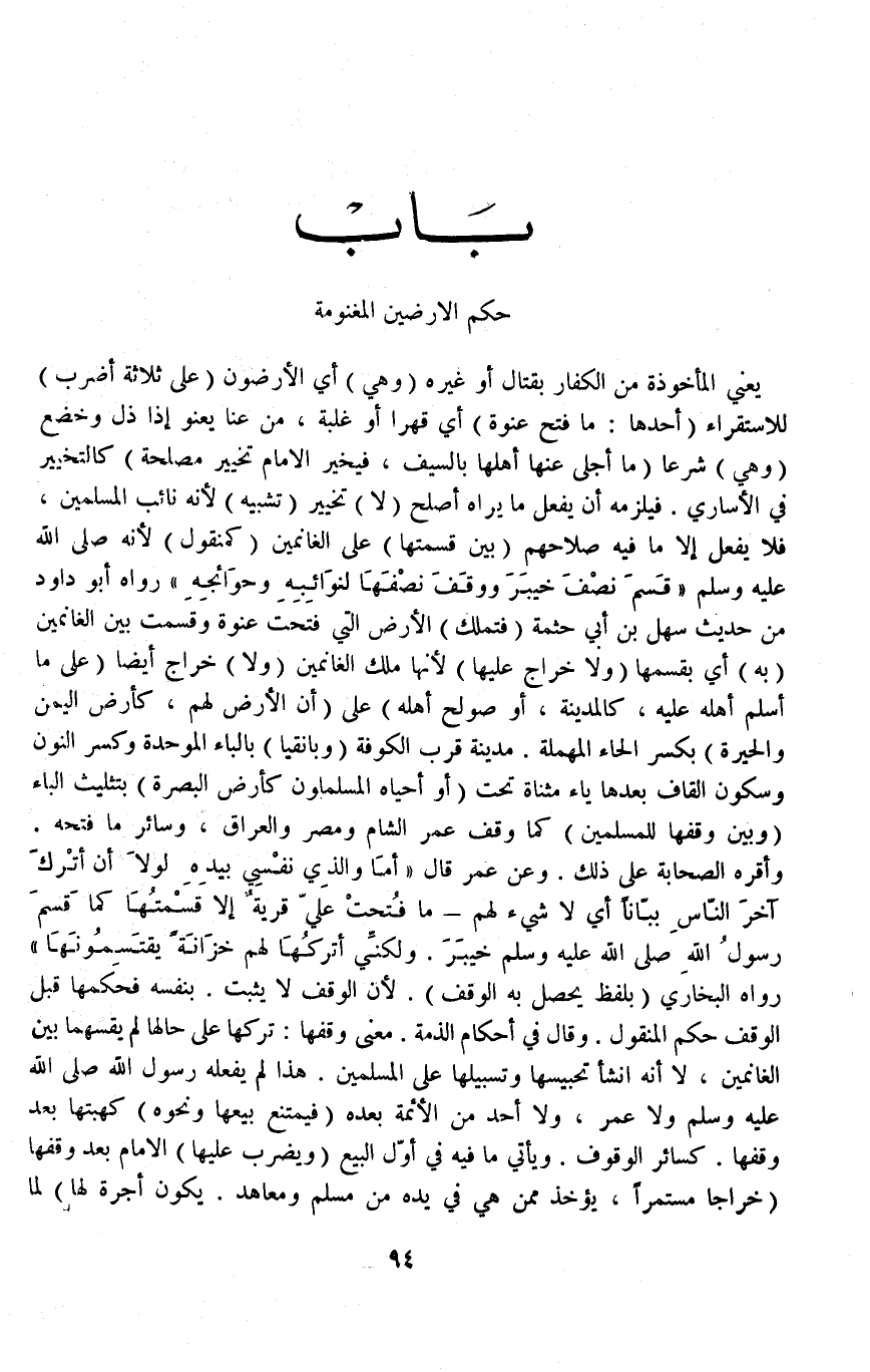 ، وَعَنْ عُمَرَ قَالَ " أَمَا، وَاَلَّذِي نَفْسِي بِيَدِهِ لَوْلَا أَنْ أَتْرُكَ آخِرَ النَّاسِ بَبَّانًا أَيْ: لَا شَيْءَ لَهُمْ - مَا فُتِحَتْ عَلَيَّ قَرْيَةٌ إلَّا قَسَمْتُهَا كَمَا قَسَمَ رَسُولُ اللَّهِ - صَلَّى اللَّهُ عَلَيْهِ وَسَلَّمَ - خَيْبَرَ، وَلَكِنِّي أَتْرُكُهَا لَهُمْ خِزَانَةً يَقْتَسِمُونَهَا " - رَوَاهُ الْبُخَارِيُّ (بِلَفْظٍ يَحْصُلُ بِهِ الْوَقْفُ) .