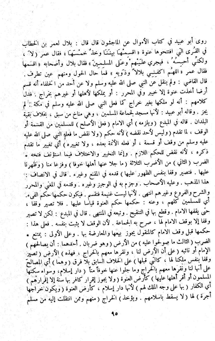 رَوَى أَبُو عُبَيْدٍ فِي كِتَابِ الْأَمْوَالِ عَنْ الْمَاجِشُونِ قَالَ: قَالَ بِلَالٌ لِعُمَرَ بْنِ الْخَطَّابِ فِي الْقُرَى الَّتِي افْتَتَحُوهَا عَنْوَةً: " اقْسِمْهَا بَيْنَنَا، وَخُذْ خُمْسَهَا " فَقَالَ عُمَرُ: لَا، وَلَكِنِّي أَحْبِسُهُ، فَيَجْرِي عَلَيْهِمْ، وَعَلَى الْمُسْلِمِينَ " فَقَالَ بِلَالٌ، وَأَصْحَابُهُ " اقْسِمْهَا فَقَالَ عُمَرُ " اللَّهُمَّ اكْفِنِي بِلَالًا، وَذَوِيهِ " فَمَا حَالَ الْحَوْلُ، وَمِنْهُمْ عَيْنٌ تَطْرِفُ قَالَ الْقَاضِي: وَلَمْ يُنْقَلْ عَنْ النَّبِيِّ - صَلَّى اللَّهُ عَلَيْهِ وَسَلَّمَ -، وَلَا عَنْ أَحَدٍ مِنْ الْخُلَفَاءِ أَنَّهُ قَسَمَ أَرْضًا أُخِذَتْ عَنْوَةً إلَّا خَيْبَرَ.