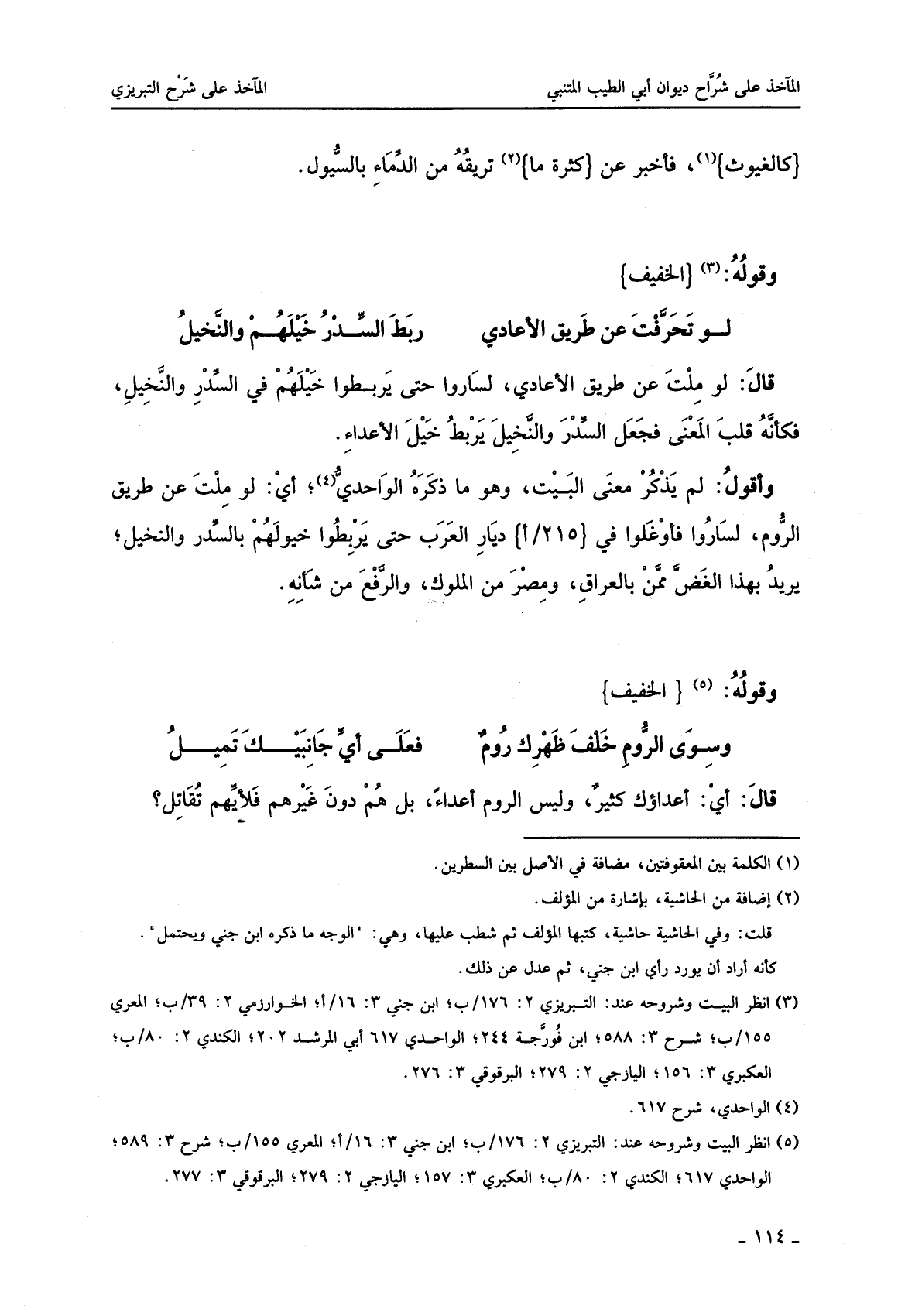 وأقول: لم يذكر معنى البيت، وهو ما ذكره الواحدي؛ أي: لو ملت عن طريق الروم، لساروا فأوغلوا في ديار العرب حتى يربطوا خيولهم بالسدر والنخيل؛ يريد بهذا الغض ممن بالعراق، ومصر من الملوك، والرفع من شانه.
