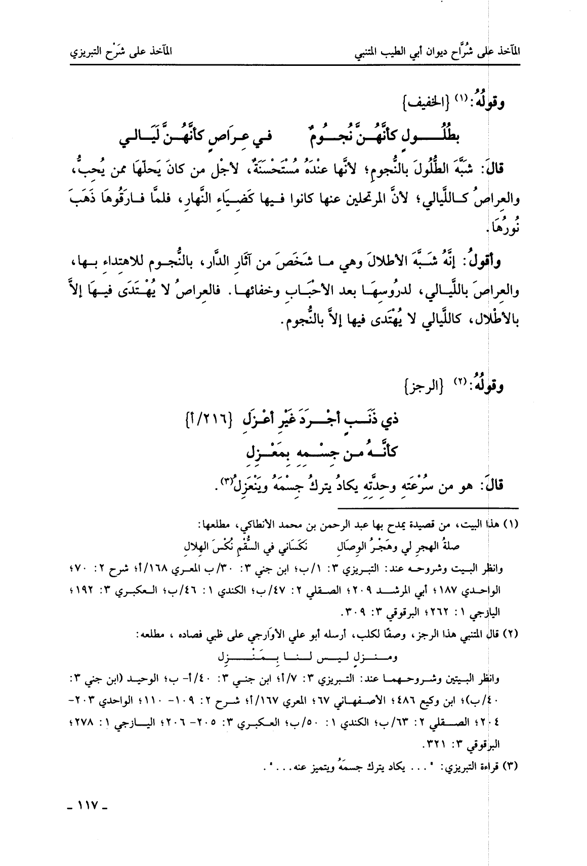 وأقول: إنه شبه الأطلال وهي ما شخص من آثار الدار، بالنجوم للاهتداء بها، والعراص بالليالي، لدروسها بعد الأحباب وخفائها. فالعراص لا يهتدي فيها إلا بالأطلال، كالليالي لا يهتدي فيها إلا بالنجوم.