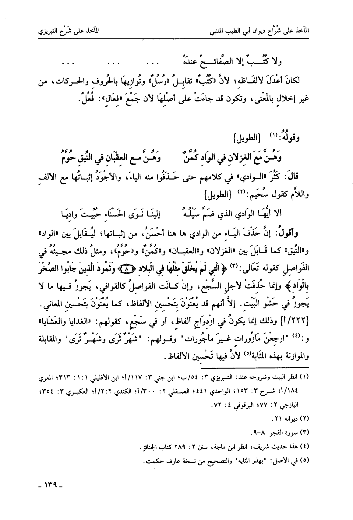 وأقول: إن حذف الياء من الوادي هاهنا أحسن، من اثباتها؛ ليقابل بين (الواد) و (النيق) كما قابل بين (الغزلان) و (العقبان) و (كمن) و (حوم)، ومثل ذلك مجيئه في الفواصل كقوله تعالى: (الَّتِي لَمْ يُخْلَقْ مِثْلُهَا فِي البْلادِ وَثَمُودَ الَّذِينَ جَابُوا الصَّخْرَ بِالْوَادِ) وإنما حذفت لأجل السجع، وإن كانت الفواصل كالقوافي، يجوز فيها ما لا يجوز في حشو البيت. إلا أنهم قد يعنون بتحسين الالفاظ، كما يعنون بتحسين المعاني. وذلك إنما يكون في ازدواج ألفاظ، أو في سجع، كقولهم: (الغدايا والعشايا) و: ارجعن مأزورات غير مأجورات وقولهم: شهر ثري وشهر ترى والمقابلة والموازنة بهذه المثابة لأن فيها تحسين الألفاظ.