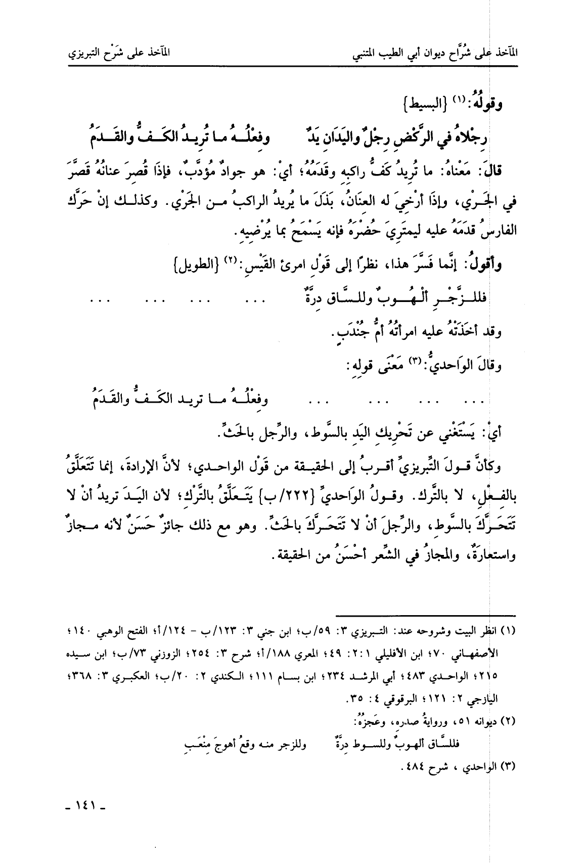 وكأن قول التبريزي اقرب إلى الحقيقة من قول الواحدي؛ لأن الإرادة، إنما تتعلق بالفعل، لا بالترك. وقول الواحدي يتعلق بالترك؛ لأن اليد تريد أن لا تتحرك بالسوط، والرجل أن لا تتحرك بالحث. وهو مع ذلك جائز حسن لأنه مجاز واستعارة، والمجاز في الشعر أحسن من الحقيقة.