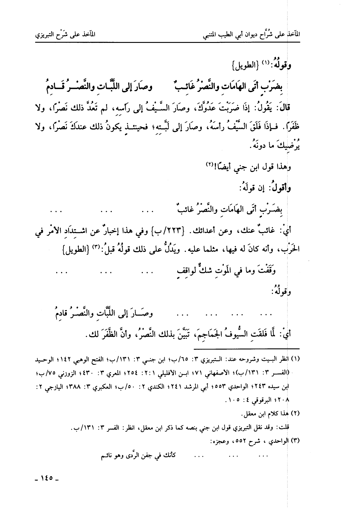 بِضَرْبٍ أتَى الهَامَاتِ والنَّصْرُ غَائِبٌ ... وصَارَ إلى اللّبَّاتِ والنَّصْرُ قَادِمُ