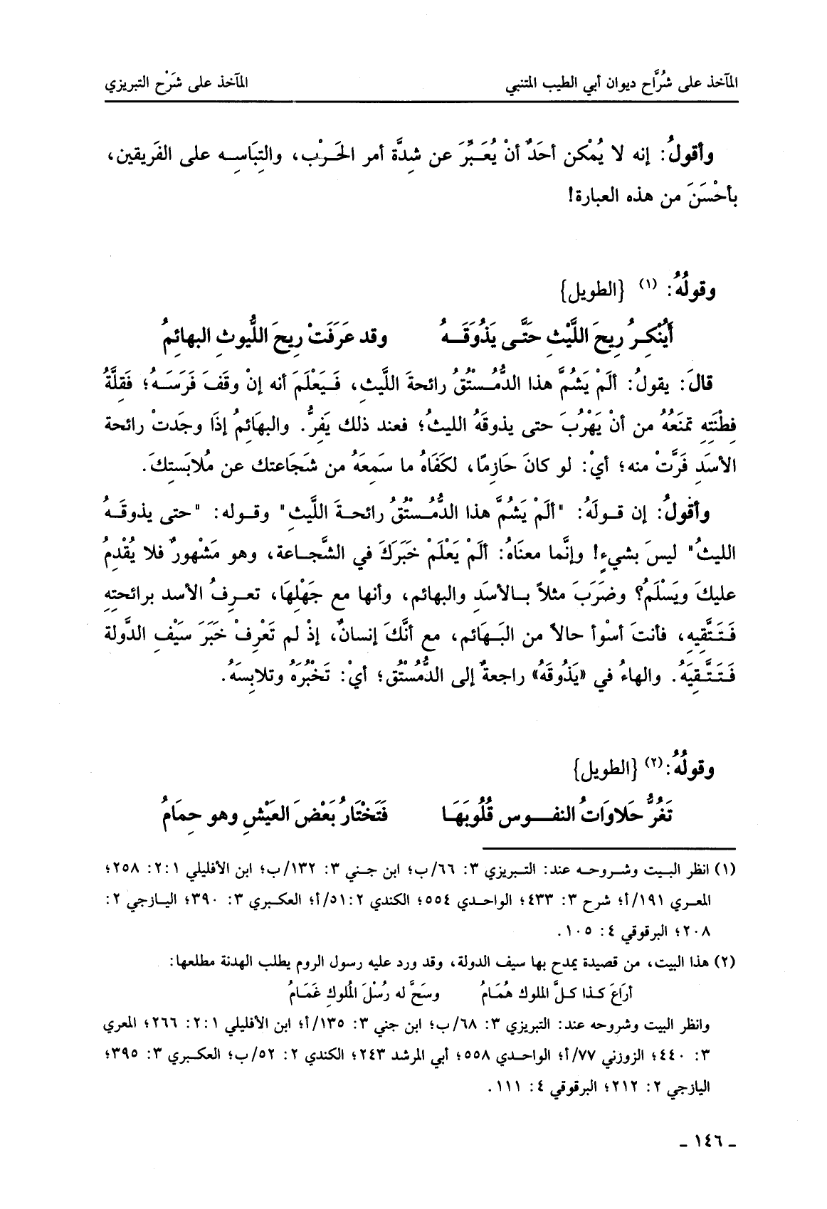 وأقول: إن قوله: ألم يشم هذا الدمستق رائحة الليث وقوله: حتى يذوقه الليث ليس بشيء! وإنما معناه: ألم يعلم خبرك في الشجاعة، وهو مشهور فلا يقدم عليك ويسلم؟ وضرب مثلا بالأسد والبهائم، وإنها مع جهلها، تعرف الأسد برائحته فتتقيه، فأنت أسوأ حالا من البهائم، مع إنك إنسان، إذ لم تعرف خبر سيف الدولة فتتقيه. والهاء في (يذوقه) راجعة إلى الدمستق؛ أي: تخبره وتلابسه.