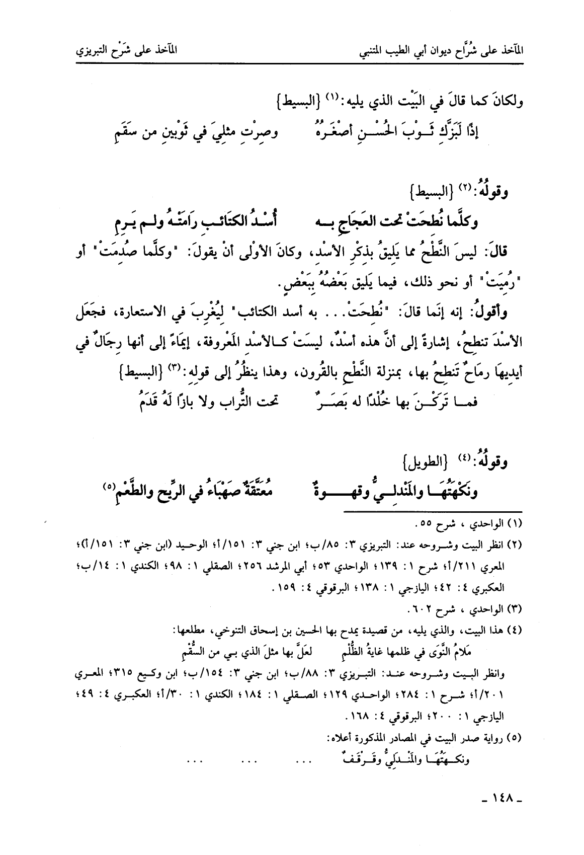 وأقول: إنه إنما قال: نطحت. . . به أسد الكتائب ليغرب في الاستعارة، فجعل الأسد تنطح، إشارة إلى أن هذه أسد، ليست كالأسد المعروفة، إيماء إلى إنها رجال في أيديها رماح تنطح بها، بمنزلة النطح بالقرون، وهذا ينظر إلى قوله: البسيط