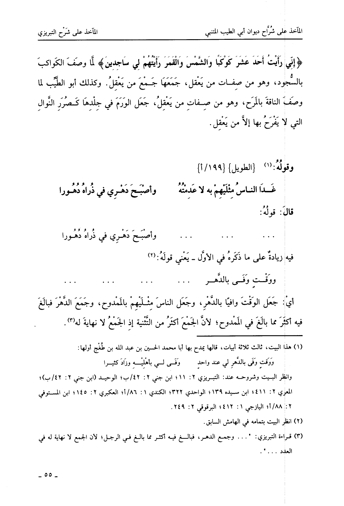 إني رأيتٌ أحدَ عَشرَ كَوكباً والشمسَ والقَمر رأيتهمْ لي ساجدينَ لما وصف الكوكب بالسجود، وهو من صفات من يعقل، جمعها جمع من يعقل. وكذلك أو الطيب لما وصف الناقة بالمرح، وهو من وصفات من يعقل، جعل الورم في جلدها كصرر