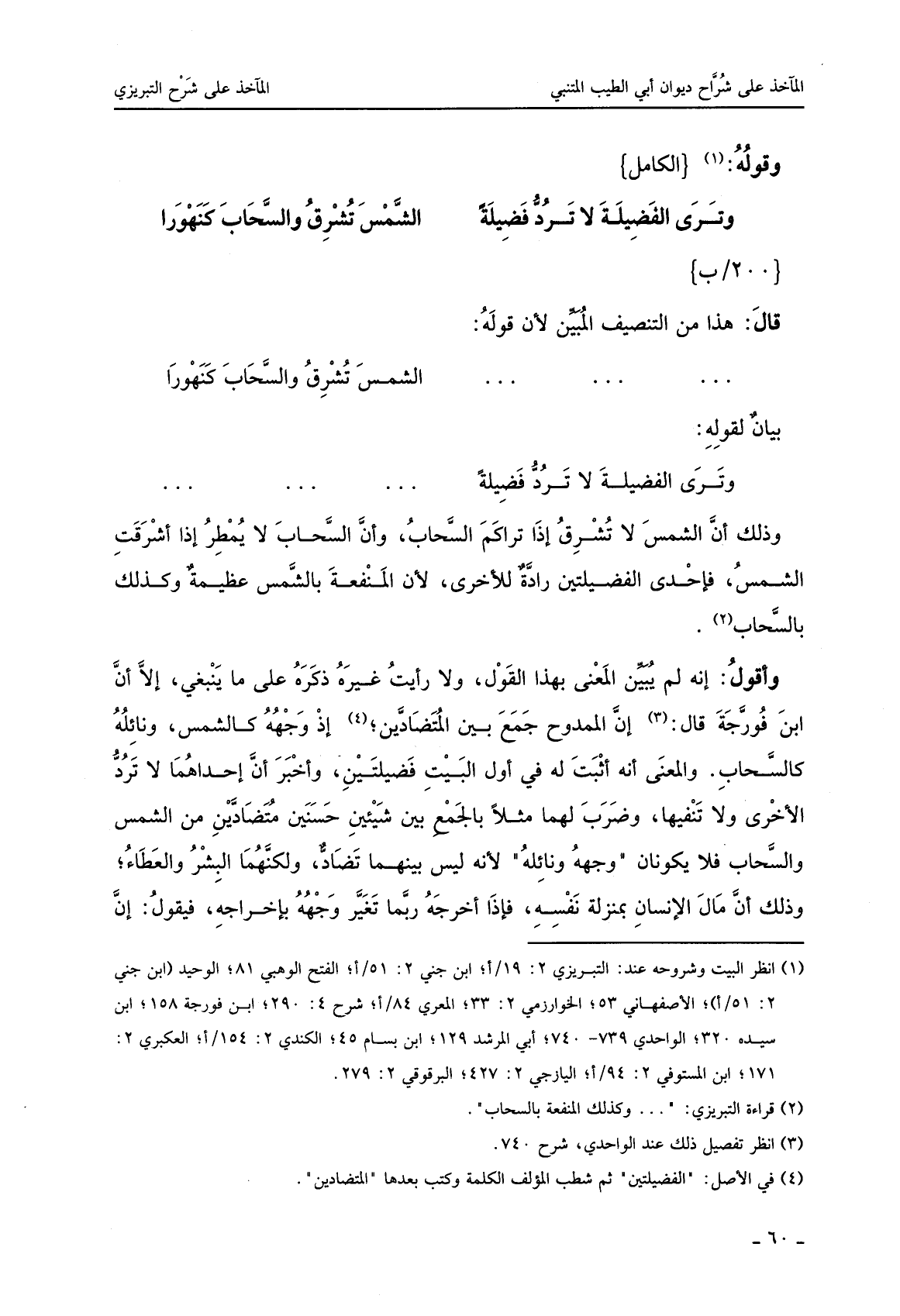 وأقول: إنه لم يبين المعنى بهذا القول، ولا رأيت غيره ذكره على ما ينبغي، إلا أن ابن فورجة قال: إن الممدوح جمع بين المتضادين؛ إذ وجهه كالشمس، ونائله كالسحاب. والمعنى إنه أثبت له في أول البيت فضيلتين، وأخبر أن أحدهما لا ترد الأخرى ولا تنفيها، وضرب لهما مثلا بالجمع بين شيئين حسنين متضادين من الشمس والسحاب فلا يكونان وجهه ونائله لأنه ليس بينهما تضاد، ولكنهما البشر والعطاء؛ وذلك أن مال الإنسان بمنزلة نفسه، فإذا أخرجه ربما تغير وجهه بإخراجه، فيقول: إن