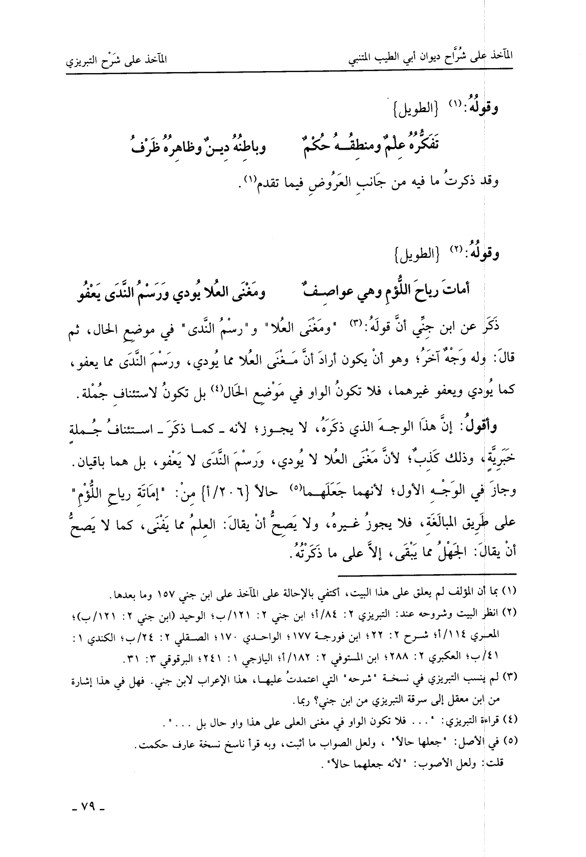 ذكر عن ابن جني أن قوله: ومغنى العلا ورسم الندى في موضع الحال، ثم قال: وله وجه آخر؛ وهو أن يكون أراد أن مغنى العلا مما يودي، ورسم الندى مما يعفو، كما يودي ويعفو غيرهما، فلا تكون الواو في موضع الحال بل تكون لاستئناف جملة.