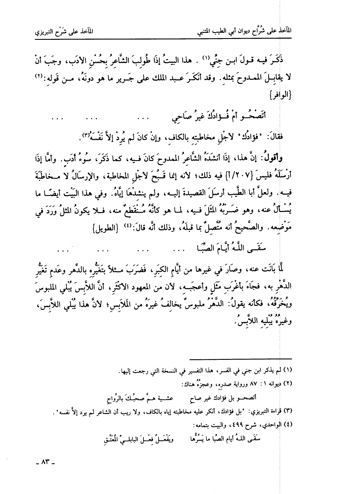 ذكر فيه قول ابن جني. هذا البيت إذا طولب الشاعر بحسن الأدب، وجب أن لا يقابل الممدوح بمثله. وقد أنكر عبد الملك على جرير ما هو دونه، من قوله: الوافر