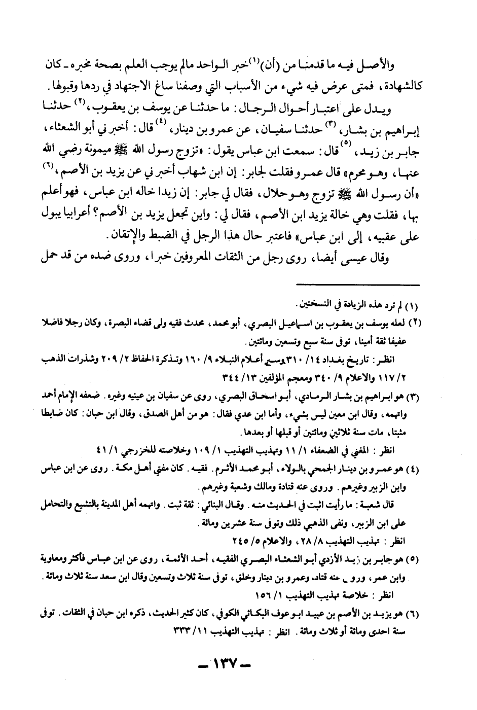 وَيَدُلُّ عَلَى اعْتِبَارِ أَحْوَالِ الرِّجَالِ: مَا حَدَّثَنَا عَنْ يُوسُفَ بْنِ يَعْقُوبَ، حَدَّثَنَا إبْرَاهِيمُ بْنُ بَشَّارٍ، حَدَّثَنَا سُفْيَانُ، عَنْ عَمْرِو بْنِ دِينَارٍ، قَالَ: أَخْبَرَنِي أَبُو الشَّعْثَاءِ جَابِرُ بْنُ زَيْدٍ، قَالَ: سَمِعْتُ ابْنَ عَبَّاسٍ يَقُولُ: «تَزَوَّجَ رَسُولُ اللَّهِ - صَلَّى اللَّهُ عَلَيْهِ وَسَلَّمَ - مَيْمُونَةَ - رَضِيَ اللَّهُ عَنْهَا -، وَهُوَ مُحْرِمٌ» قَالَ عَمْرٌو فَقُلْتُ لِجَابِرٍ: إنَّ ابْنَ شِهَابٍ أَخْبَرَنِي عَنْ يَزِيدَ بْنِ الْأَصَمِّ، «أَنَّ رَسُولَ اللَّهِ - صَلَّى اللَّهُ عَلَيْهِ وَسَلَّمَ - تَزَوَّجَ وَهُوَ حَلَالٌ» ، فَقَالَ لِي جَابِرٌ: إنَّ زَيْدًا خَالُهُ ابْنُ عَبَّاسٍ، فَهُوَ أَعْلَمُ بِهَا، فَقُلْت وَهِيَ خَالَةُ يَزِيدَ بْنِ الْأَصَمِّ، فَقَالَ لِي: وَأَيْنَ تَجْعَلُ يَزِيدَ بْنَ الْأَصَمِّ؟ أَعْرَابِيًّا يَبُولُ عَلَى عَقِبَيْهِ، إلَى ابْنِ عَبَّاسٍ " فَاعْتُبِرَ حَالُ هَذَا الرَّجُلِ فِي الضَّبْطِ وَالْإِتْقَانِ.