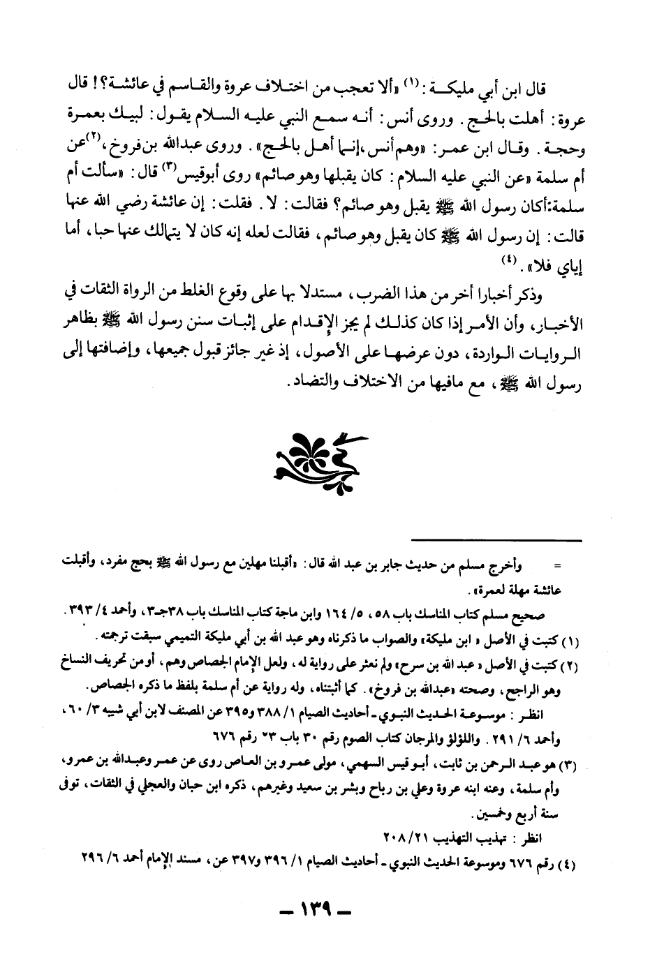 قَالَ ابْنُ أَبِي مُلَيْكَةَ: " أَلَا تَعْجَبُ مِنْ اخْتِلَافِ عُرْوَةَ وَالْقَاسِمِ فِي عَائِشَةَ؟ قَالَ عُرْوَةُ: أَهَلَّتْ بِالْحَجِّ. وَرَوَى «أَنَسٌ: أَنَّهُ سَمِعَ النَّبِيَّ - عَلَيْهِ السَّلَامُ - يَقُولُ: لَبَّيْكَ بِعُمْرَةٍ وَحَجَّةٍ» . وَقَالَ ابْنُ عُمَرَ: " وَهُمْ أَنَسٌ، إنَّمَا أَهَلَّ بِالْحَجِّ ". وَرَوَى عَبْدُ اللَّهِ بْنُ فَرُّوخَ، عَنْ «أُمِّ سَلَمَةَ عَنْ النَّبِيِّ - عَلَيْهِ السَّلَامُ -: كَانَ يُقَبِّلُهَا وَهُوَ صَائِمٌ» رَوَى أَبُو قَيْسٍ قَالَ: «سَأَلْتُ أُمَّ سَلَمَةَ: أَكَانَ رَسُولُ اللَّهِ - صَلَّى اللَّهُ عَلَيْهِ وَسَلَّمَ - يُقَبِّلُ وَهُوَ صَائِمٌ؟ فَقَالَتْ: لَا. فَقُلْتُ: إنَّ عَائِشَةَ - رَضِيَ اللَّهُ عَنْهَا - قَالَتْ: إنَّ رَسُولَ اللَّهِ - صَلَّى اللَّهُ عَلَيْهِ وَسَلَّمَ - كَانَ يُقَبِّلُ وَهُوَ صَائِمٌ، فَقَالَتْ لَعَلَّهُ إنَّهُ كَانَ لَا يَتَمَالَكُ عَنْهَا حُبًّا، أَمَّا إيَّايَ فَلَا» .