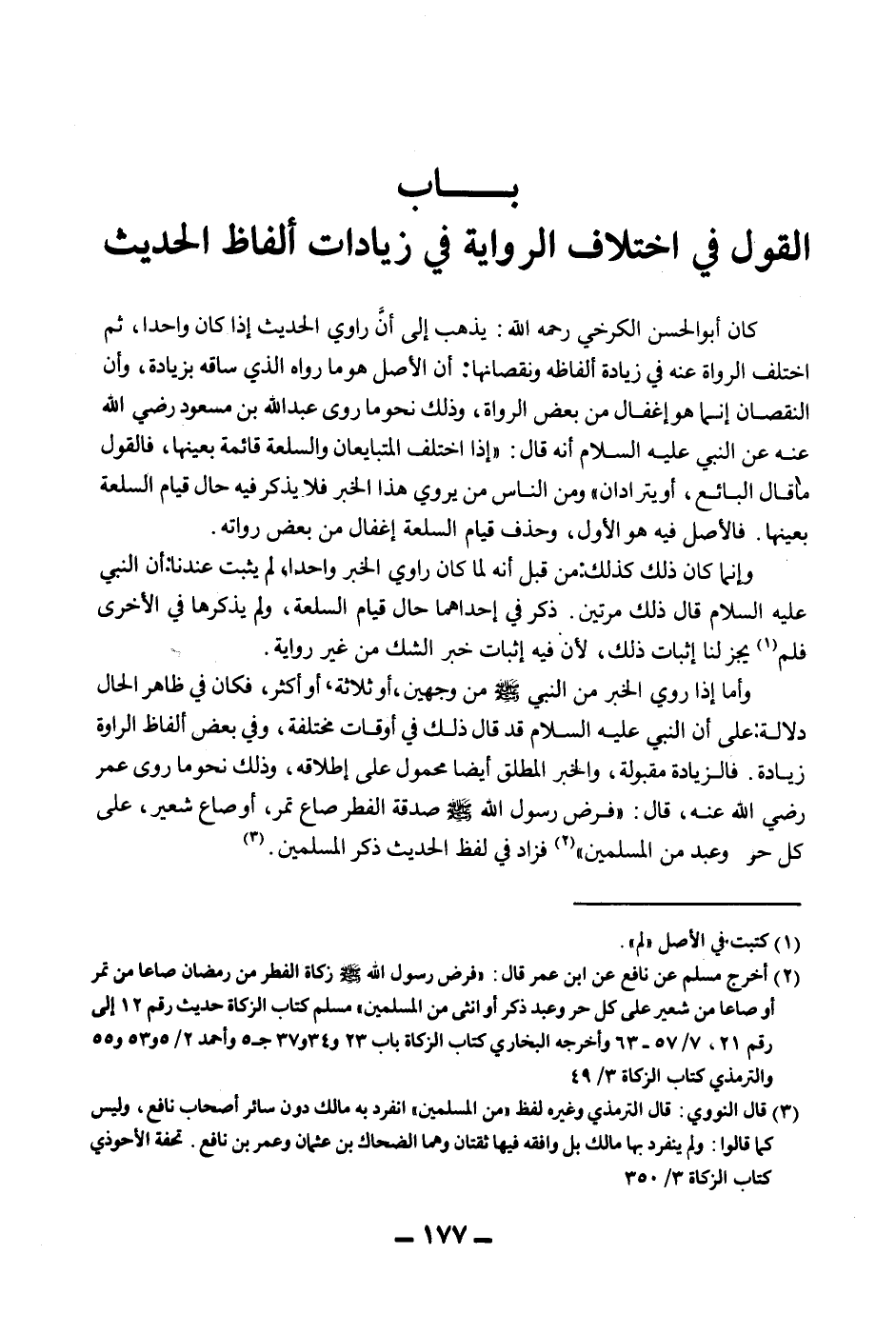 الْقَوْلُ فِي اخْتِلَافِ الرِّوَايَةِ فِي زِيَادَاتِ أَلْفَاظِ الْحَدِيثِ كَانَ أَبُو الْحَسَنِ الْكَرْخِيُّ - رَحِمَهُ اللَّهُ -: يَذْهَبُ إلَى أَنَّ رَاوِيَ الْحَدِيثِ إذَا كَانَ وَاحِدًا، ثُمَّ اخْتَلَفَ الرُّوَاةُ عَنْهُ فِي زِيَادَةِ أَلْفَاظِهِ وَنُقْصَانِهَا: إنَّ الْأَصْلَ هُوَ مَا رَوَاهُ الَّذِي سَاقَهُ بِزِيَادَةٍ، وَأَنَّ النُّقْصَانَ إنَّمَا هُوَ إغْفَالٌ مِنْ بَعْضِ الرُّوَاةِ، وَذَلِكَ نَحْوُ مَا رَوَى عَبْدُ اللَّهِ بْنُ مَسْعُودٍ - رَضِيَ اللَّهُ عَنْهُ - عَنْ النَّبِيِّ - عَلَيْهِ السَّلَامُ - أَنَّهُ قَالَ: «إذَا اخْتَلَفَ الْمُتَبَايِعَانِ وَالسِّلْعَةُ قَائِمَةٌ بِعَيْنِهَا، فَالْقَوْلُ مَا قَالَ الْبَائِعُ، أَوْ يَتَرَادَّانِ» وَمِنْ النَّاسِ مِنْ يَرْوِي هَذَا الْخَبَرَ فَلَا يَذْكُرُ فِيهِ حَالَ قِيَامِ السِّلْعَةِ بِعَيْنِهَا. فَالْأَصْلُ فِيهِ هُوَ الْأَوَّلُ، وَحَذْفُ قِيَامِ السِّلْعَةِ إغْفَالٌ مِنْ بَعْضِ رُوَاتِهِ.
