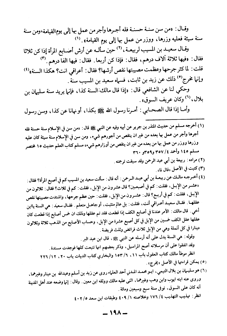 وَقَالَ سَعِيدُ بْنُ الْمُسَيِّبِ لِرَبِيعَةَ، حِينَ سَأَلَهُ عَنْ أَرْشِ أَصَابِعِ الْمَرْأَةِ إذَا كُنَّ ثَلَاثًا فَقَالَ: " فِيهَا ثَلَاثَةُ آلَافِ دِرْهَمٍ، فَقَالَ: فَإِذَا كُنَّ أَرْبَعًا. فَقَالَ: فِيهَا أَلْفَا دِرْهَمٍ. قُلْت: لَمَّا كَثُرَ جُرْحُهَا وَعَظُمَتْ مُصِيبَتُهَا نَقَصَ أَرْشُهَا؟ فَقَالَ: أَعِرَاقِيٌّ أَنْتَ؟ هَكَذَا السُّنَّةُ " وَإِنَّمَا مَخْرَجُ ذَلِكَ عَنْ زَيْدِ بْنِ ثَابِتٍ، فَسَمَّاهُ سَعِيدُ بْنُ الْمُسَيِّبِ سُنَّةً.
