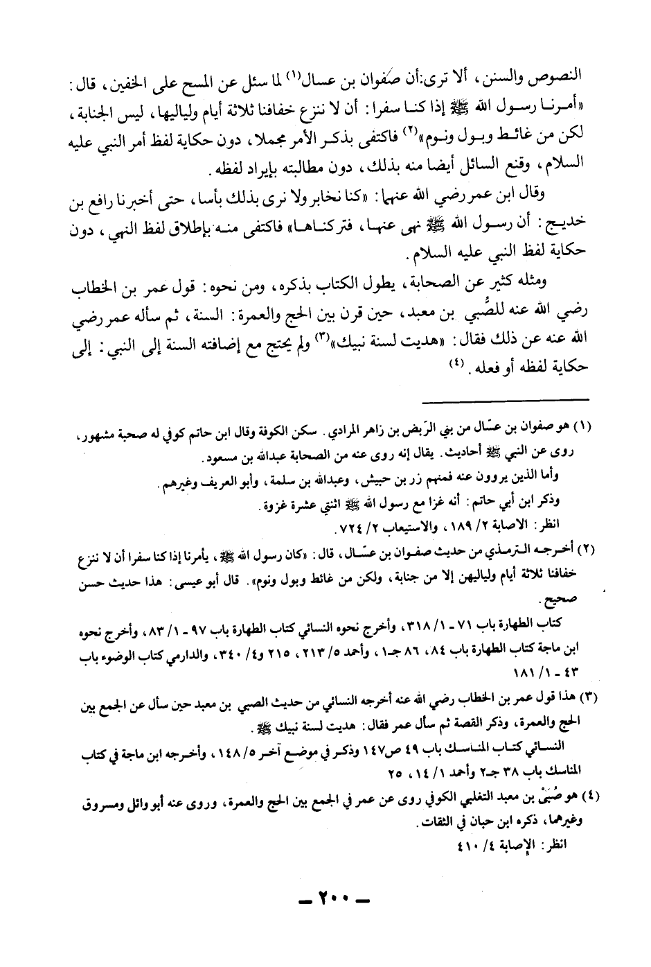 النُّصُوصِ وَالسُّنَنِ، أَلَا تَرَى: أَنَّ صَفْوَانَ بْنَ عَسَّالٍ لَمَّا سُئِلَ عَنْ الْمَسْحِ عَلَى الْخُفَّيْنِ، قَالَ: «أَمَرَنَا رَسُولُ اللَّهِ - صَلَّى اللَّهُ عَلَيْهِ وَسَلَّمَ - إذَا كُنَّا سَفَرًا: أَنْ لَا نَنْزِعَ خِفَافَنَا ثَلَاثَةَ أَيَّامٍ وَلَيَالِيَهَا، لَيْسَ الْجَنَابَةَ، لَكِنْ مِنْ غَائِطٍ وَبَوْلٍ وَنَوْمٍ» فَاكْتَفَى بِذِكْرِ الْأَمْرِ مُجْمَلًا، دُونَ حِكَايَةِ لَفْظِ أَمْرِ النَّبِيِّ - عَلَيْهِ السَّلَامُ -، وَقَنَعَ السَّائِلُ أَيْضًا مِنْهُ بِذَلِكَ، دُونَ مُطَالَبَتِهِ بِإِيرَادِ لَفْظِهِ.