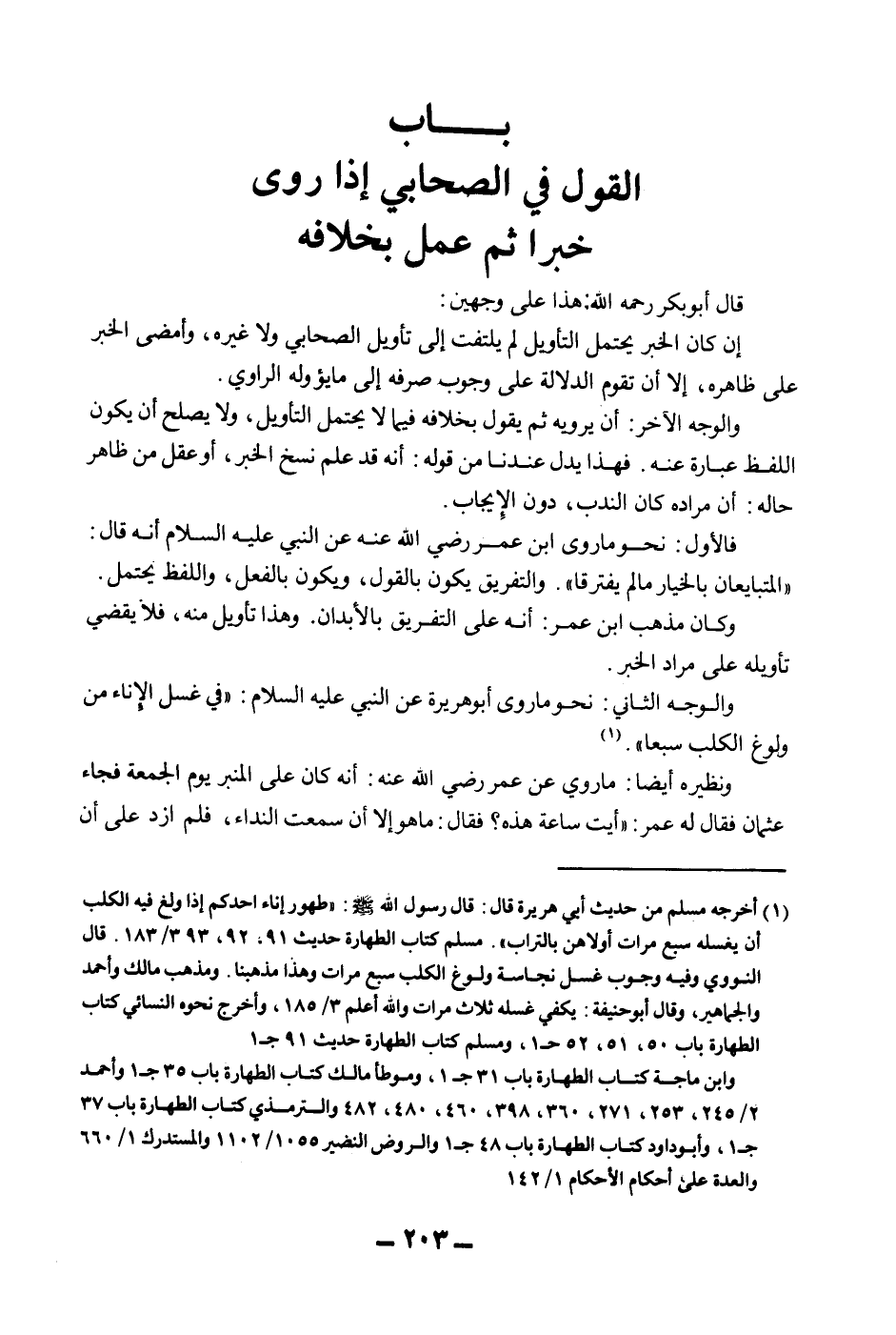 قَالَ أَبُو بَكْرٍ - رَحِمَهُ اللَّهُ -: هَذَا عَلَى وَجْهَيْنِ: إنْ كَانَ الْخَبَرُ يَحْتَمِلُ التَّأْوِيلَ لَمْ يُلْتَفَتْ إلَى تَأْوِيلِ الصَّحَابِيِّ وَلَا غَيْرِهِ، وَأَمْضَى الْخَبَرَ عَلَى ظَاهِرِهِ، إلَّا أَنْ تَقُومَ الدَّلَالَةُ عَلَى وُجُوبِ صَرْفِهِ إلَى مَا يُؤَوِّلُهُ الرَّاوِي.
