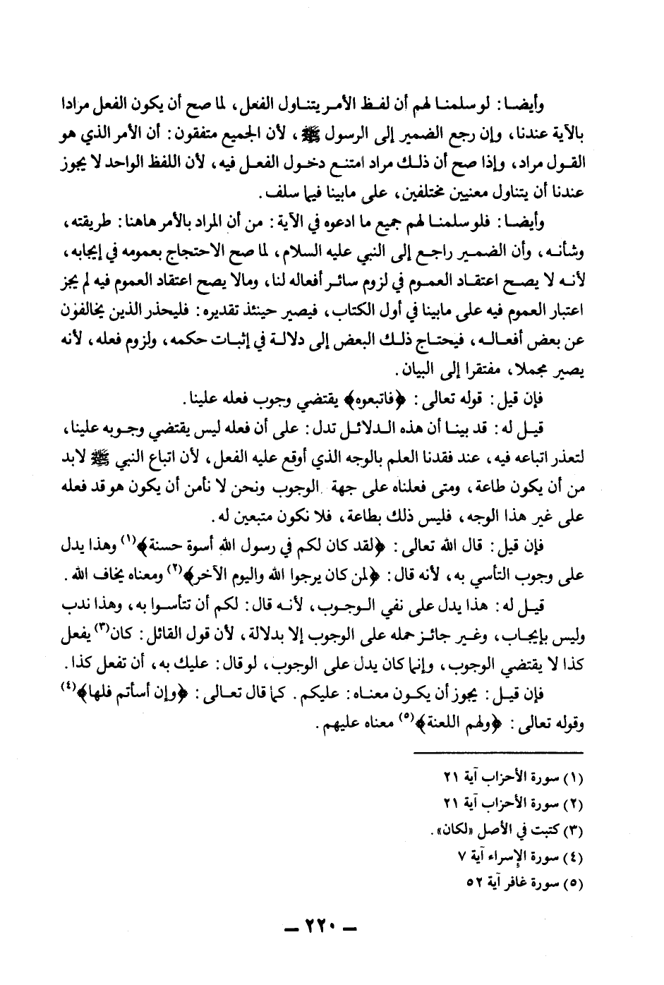 وَأَيْضًا: فَلَوْ سَلَّمْنَا لَهُمْ جَمِيعَ مَا ادَّعَوْهُ فِي الْآيَةِ: مِنْ أَنَّ الْمُرَادَ بِالْأَمْرِ هَاهُنَا: طَرِيقَتُهُ، وَشَأْنُهُ، وَأَنَّ الضَّمِيرَ رَاجِعٌ إلَى النَّبِيِّ - عَلَيْهِ السَّلَامُ -، لَمَا صَحَّ الِاحْتِجَاجُ بِعُمُومِهِ فِي إيجَابِهِ، لِأَنَّهُ لَا يَصِحُّ اعْتِقَادُ الْعُمُومِ فِي لُزُومِ سَائِرِ أَفْعَالِهِ لَنَا، وَمَا لَا يَصِحُّ اعْتِقَادُ الْعُمُومِ فِيهِ لَمْ يَجُزْ اعْتِبَارُ الْعُمُومِ فِيهِ عَلَى مَا بَيَّنَّا فِي أَوَّلِ الْكِتَابِ، فَيَصِيرُ حِينَئِذٍ تَقْدِيرُهُ: فَلْيَحْذَرْ الَّذِينَ يُخَالِفُونَ عَنْ بَعْضِ أَفْعَالِهِ، فَيَحْتَاجُ ذَلِكَ الْبَعْضُ إلَى دَلَالَةٍ فِي إثْبَاتِ حُكْمِهِ، وَلُزُومِ فِعْلِهِ، لِأَنَّهُ يَصِيرُ مُجْمَلًا، مُفْتَقِرًا إلَى الْبَيَانِ.
