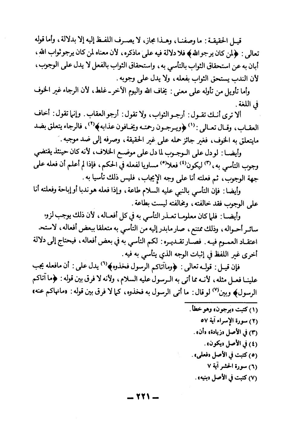 قِيلَ الْحَقِيقَةُ: مَا وَصَفْنَا، وَهَذَا مَجَازٌ، لَا يُصْرَفُ اللَّفْظُ إلَيْهِ إلَّا بِدَلَالَةٍ، وَأَمَّا قَوْله تَعَالَى: {لِمَنْ كَانَ يَرْجُو اللَّهَ} [الأحزاب: 21] فَلَا دَلَالَةَ فِيهِ عَلَى مَا ذَكَرَهُ، لِأَنَّ مَعْنَاهُ لِمَنْ كَانَ يَرْجُو ثَوَابَ اللَّهِ، أَبَانَ بِهِ عَنْ اسْتِحْقَاقِ الثَّوَابِ بِالتَّأَسِّي بِهِ، وَاسْتِحْقَاقُ الثَّوَابِ بِالْفِعْلِ لَا يَدُلُّ عَلَى الْوُجُوبِ، لِأَنَّ النَّدْبَ يَسْتَحِقُّ الثَّوَابَ بِفِعْلِهِ، وَلَا يَدُلُّ عَلَى وُجُوبِهِ.