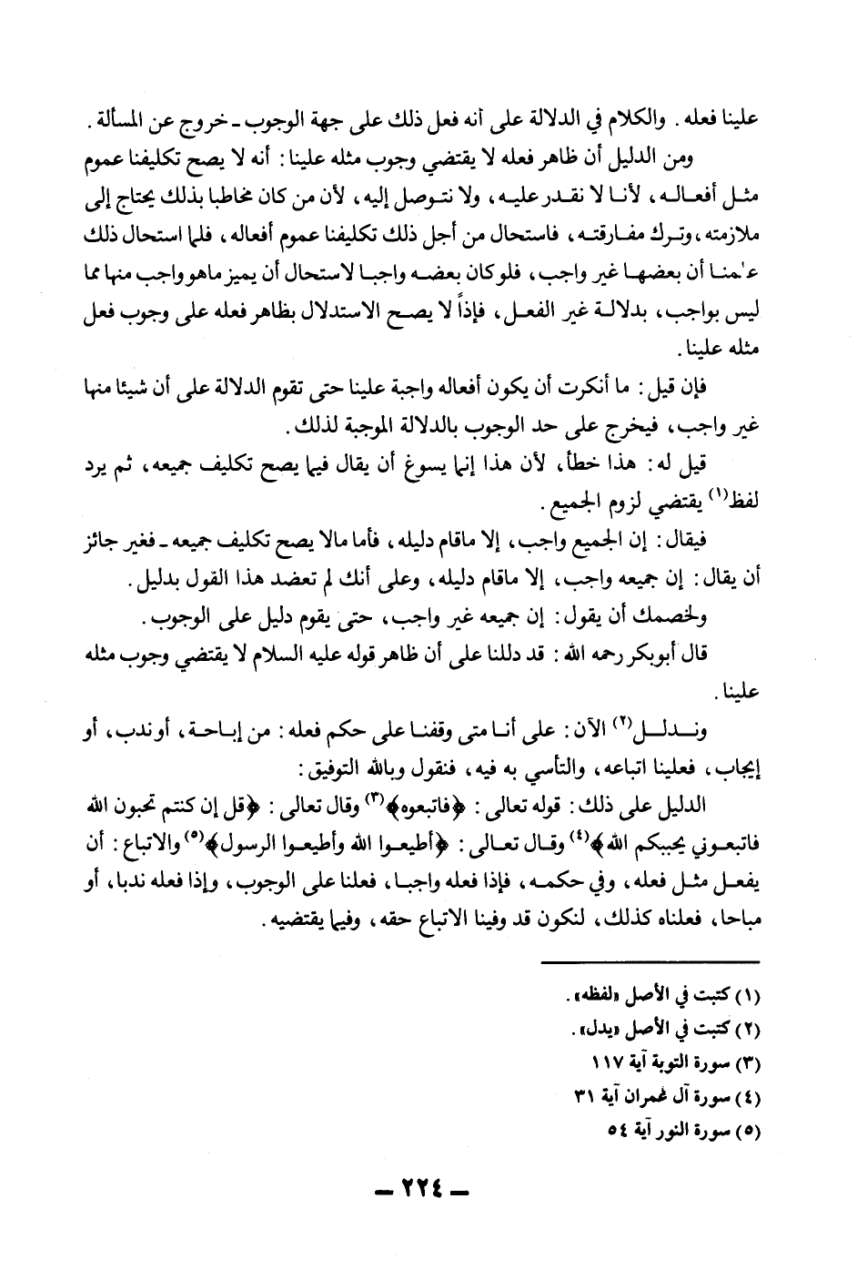 وَنُدَلِّلُ الْآنَ: عَلَى أَنَّا مَتَى وَقَفْنَا عَلَى حُكْمِ فِعْلِهِ: مِنْ إبَاحَةٍ، أَوْ نَدْبٍ، أَوْ إيجَابٍ، فَعَلَيْنَا اتِّبَاعُهُ، وَالتَّأَسِّي بِهِ فِيهِ، فَنَقُولُ وَبِاَللَّهِ التَّوْفِيقُ: الدَّلِيلُ عَلَى ذَلِكَ: قَوْله تَعَالَى: {فَاتَّبِعُوهُ} [الأنعام: 153] وَقَالَ تَعَالَى: {قُلْ إنْ كُنْتُمْ تُحِبُّونَ اللَّهَ فَاتَّبِعُونِي يُحْبِبْكُمْ اللَّهُ} [آل عمران: 31] وَقَالَ تَعَالَى: {أَطِيعُوا اللَّهَ وَأَطِيعُوا الرَّسُولَ} [النساء: 59] وَالِاتِّبَاعُ: أَنْ يُفْعَلَ مِثْلُ فِعْلِهِ، وَفِي حُكْمِهِ، فَإِذَا فَعَلَهُ وَاجِبًا، فَعَلْنَا عَلَى الْوُجُوبِ، وَإِذَا فَعَلَهُ نَدْبًا، أَوْ مُبَاحًا، فَعَلْنَاهُ كَذَلِكَ، لِنَكُونَ قَدْ وَفَّيْنَا الِاتِّبَاعَ حَقَّهُ، وَفِيمَا يَقْتَضِيهِ.