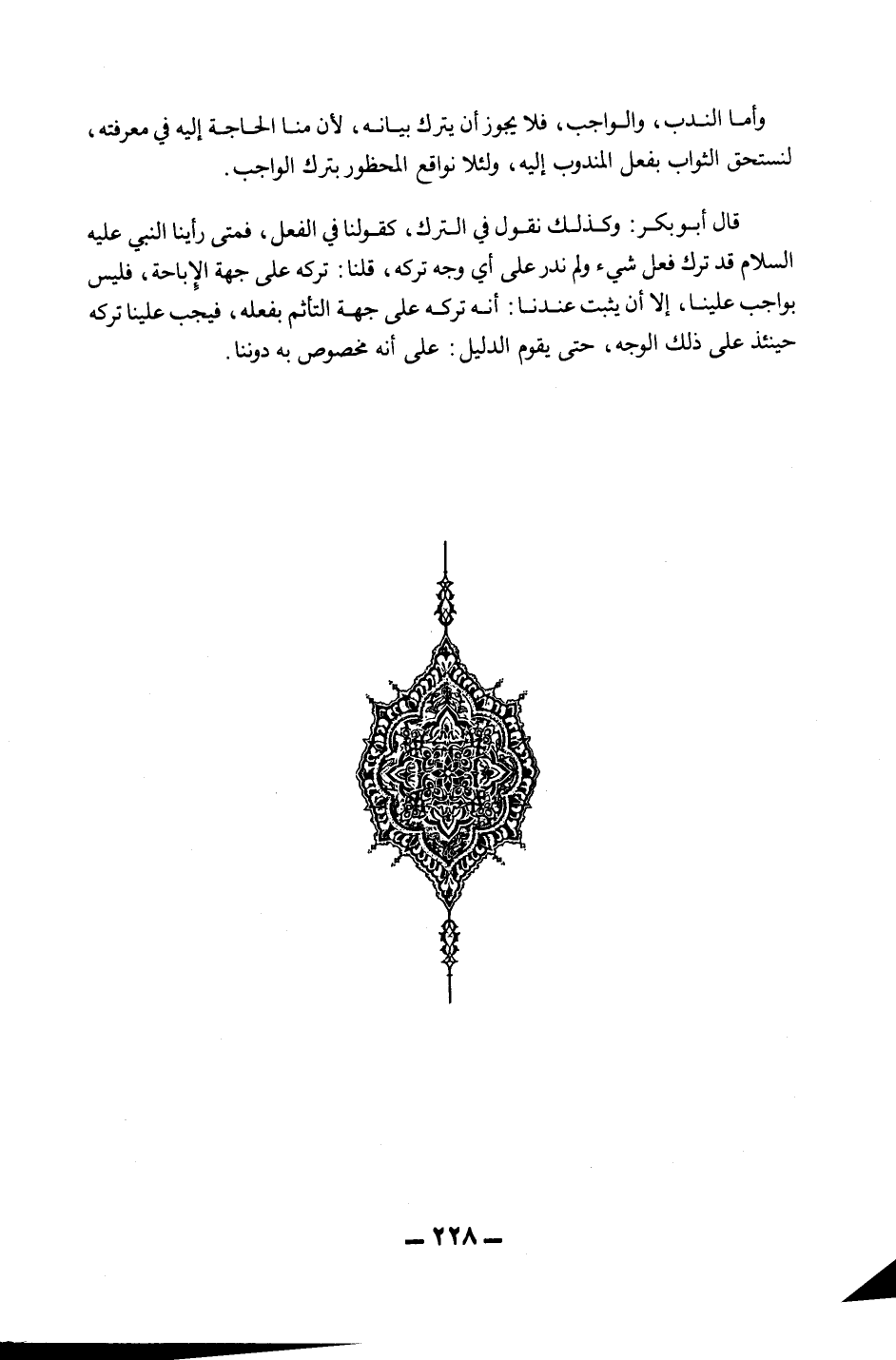 قَالَ أَبُو بَكْرٍ: وَكَذَلِكَ نَقُولُ فِي التَّرْكِ، كَقَوْلِنَا فِي الْفِعْلِ، فَمَتَى رَأَيْنَا النَّبِيَّ - عَلَيْهِ السَّلَامُ - قَدْ تَرَكَ فِعْلَ شَيْءٍ وَلَمْ نَدْرِ عَلَى أَيِّ وَجْهٍ تَرَكَهُ، قُلْنَا: تَرَكَهُ عَلَى جِهَةِ الْإِبَاحَةِ، فَلَيْسَ بِوَاجِبٍ عَلَيْنَا، إلَّا أَنْ يَثْبُتَ عِنْدَنَا: أَنَّهُ تَرَكَهُ عَلَى جِهَةِ التَّأَثُّمِ بِفِعْلِهِ، فَيَجِبُ عَلَيْنَا تَرْكُهُ حِينَئِذٍ عَلَى ذَلِكَ الْوَجْهِ، حَتَّى يَقُومَ الدَّلِيلُ: عَلَى أَنَّهُ مَخْصُوصٌ بِهِ دُونَنَا