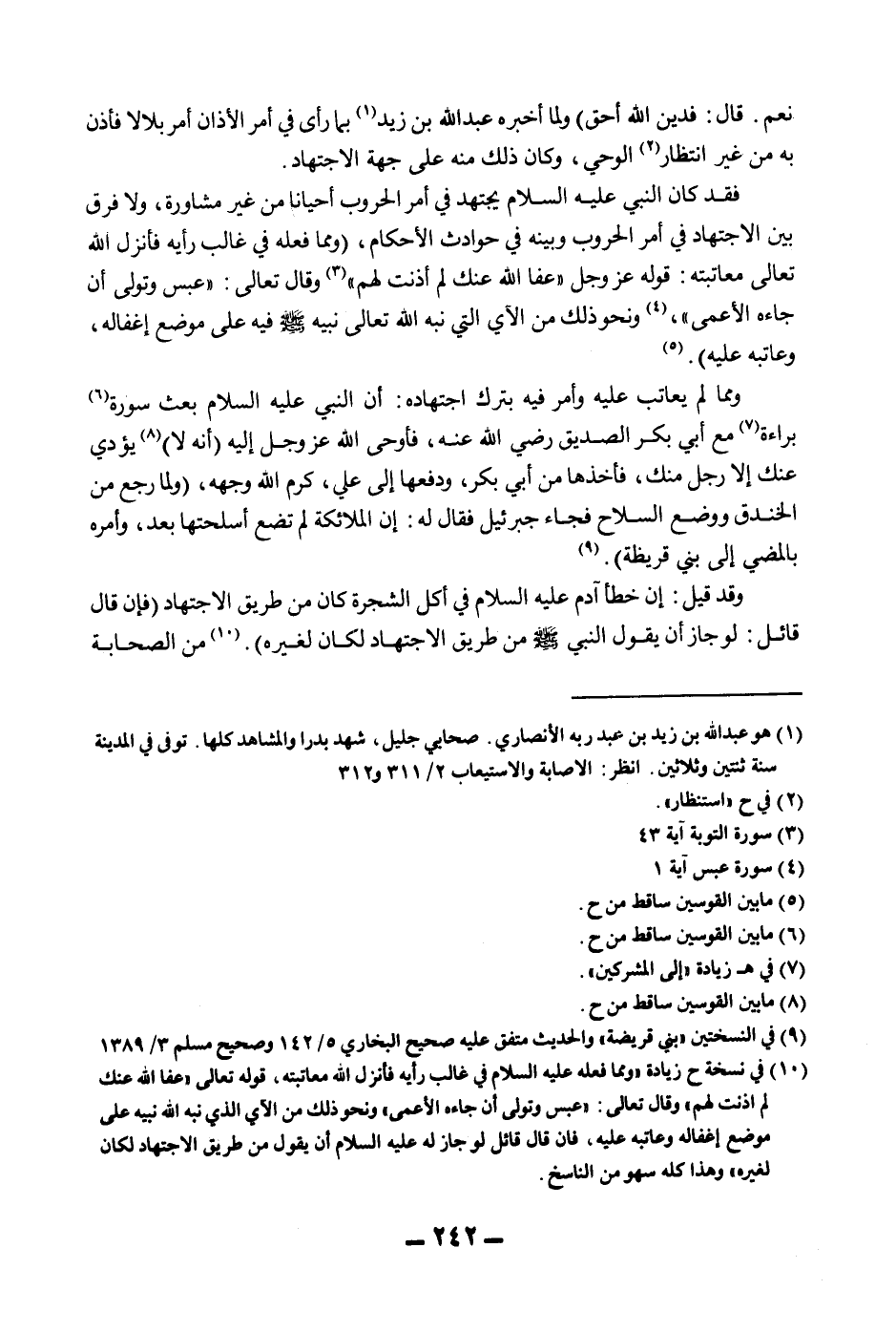 فَقَدْ «كَانَ النَّبِيُّ - عَلَيْهِ السَّلَامُ - يَجْتَهِدُ فِي أَمْرِ الْحُرُوبِ أَحْيَانًا مِنْ غَيْرِ مُشَاوَرَةٍ» ، وَلَا فَرْقَ بَيْنَ الِاجْتِهَادِ فِي أَمْرِ الْحُرُوبِ وَبَيْنَهُ فِي حَوَادِثِ الْأَحْكَامِ، (وَمِمَّا فَعَلَهُ فِي غَالِبِ رَأْيِهِ فَأَنْزَلَ اللَّهُ تَعَالَى مُعَاتَبَتَهُ: قَوْلُهُ عَزَّ وَجَلَّ {عَفَا اللَّهُ عَنْك لِمَ أَذِنْت لَهُمْ} [التوبة: 43] وَقَالَ تَعَالَى: {عَبَسَ وَتَوَلَّى} [عبس: 1] {أَنْ جَاءَهُ الأَعْمَى} [عبس: 2] ، وَنَحْوُ ذَلِكَ مِنْ الْآيِ الَّتِي نَبَّهَ اللَّهُ تَعَالَى نَبِيَّهُ - صَلَّى اللَّهُ عَلَيْهِ وَسَلَّمَ - فِيهِ عَلَى مَوْضِعِ إغْفَالِهِ، وَعَاتَبَهُ عَلَيْهِ) .