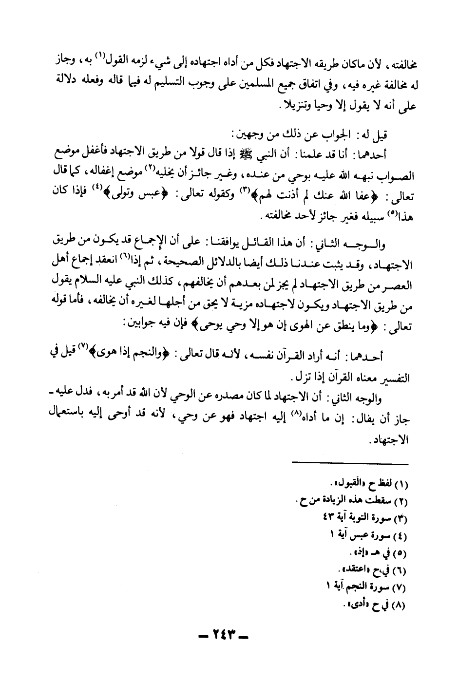 وَالْوَجْهُ الثَّانِي: أَنَّ هَذَا الْقَائِلَ يُوَافِقُنَا: عَلَى أَنَّ الْإِجْمَاعَ قَدْ يَكُونُ مِنْ طَرِيقِ الِاجْتِهَادِ، وَقَدْ يَثْبُتُ عِنْدَنَا ذَلِكَ أَيْضًا بِالدَّلَائِلِ الصَّحِيحَةِ، ثُمَّ إذَا انْعَقَدَ إجْمَاعُ أَهْلِ الْعَصْرِ مِنْ طَرِيقِ الِاجْتِهَادِ لَمْ يَجُزْ لِمَنْ بَعْدَهُمْ أَنْ يُخَالِفَهُمْ، كَذَلِكَ النَّبِيُّ - عَلَيْهِ السَّلَامُ - يَقُولُ مِنْ طَرِيقِ الِاجْتِهَادِ وَيَكُونُ لِاجْتِهَادِهِ مَزِيَّةٌ لَا يَحِقُّ مِنْ أَجْلِهَا لِغَيْرِهِ أَنْ يُخَالِفَهُ، فَأَمَّا قَوْله تَعَالَى: {وَمَا يَنْطِقُ عَنِ الْهَوَى} [النجم: 3] {إِنْ هُوَ إِلا وَحْيٌ يُوحَى} [النجم: 4] فَإِنَّ فِيهِ جَوَابَيْنِ: