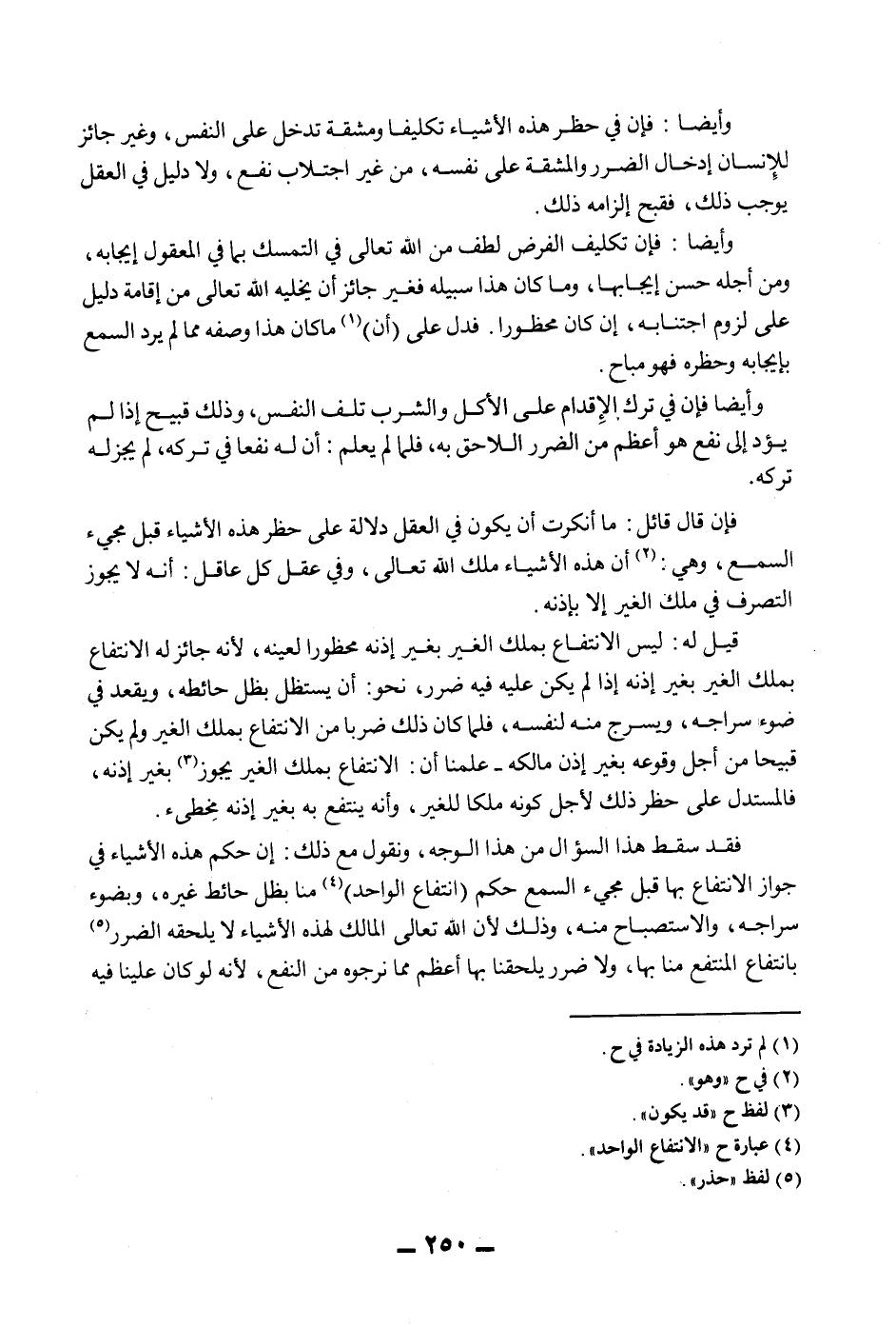 وَأَيْضًا: فَإِنَّ فِي حَظْرِ هَذِهِ الْأَشْيَاءِ تَكْلِيفًا وَمَشَقَّةً تَدْخُلُ عَلَى النَّفْسِ، وَغَيْرُ جَائِزٍ لِلْإِنْسَانِ إدْخَالُ الضَّرَرِ وَالْمَشَقَّةِ عَلَى نَفْسِهِ، مِنْ غَيْرِ اجْتِلَابِ نَفْعٍ، وَلَا دَلِيلَ فِي الْعَقْلِ يُوجِبُ ذَلِكَ، فَقَبُحَ إلْزَامُهُ ذَلِكَ.