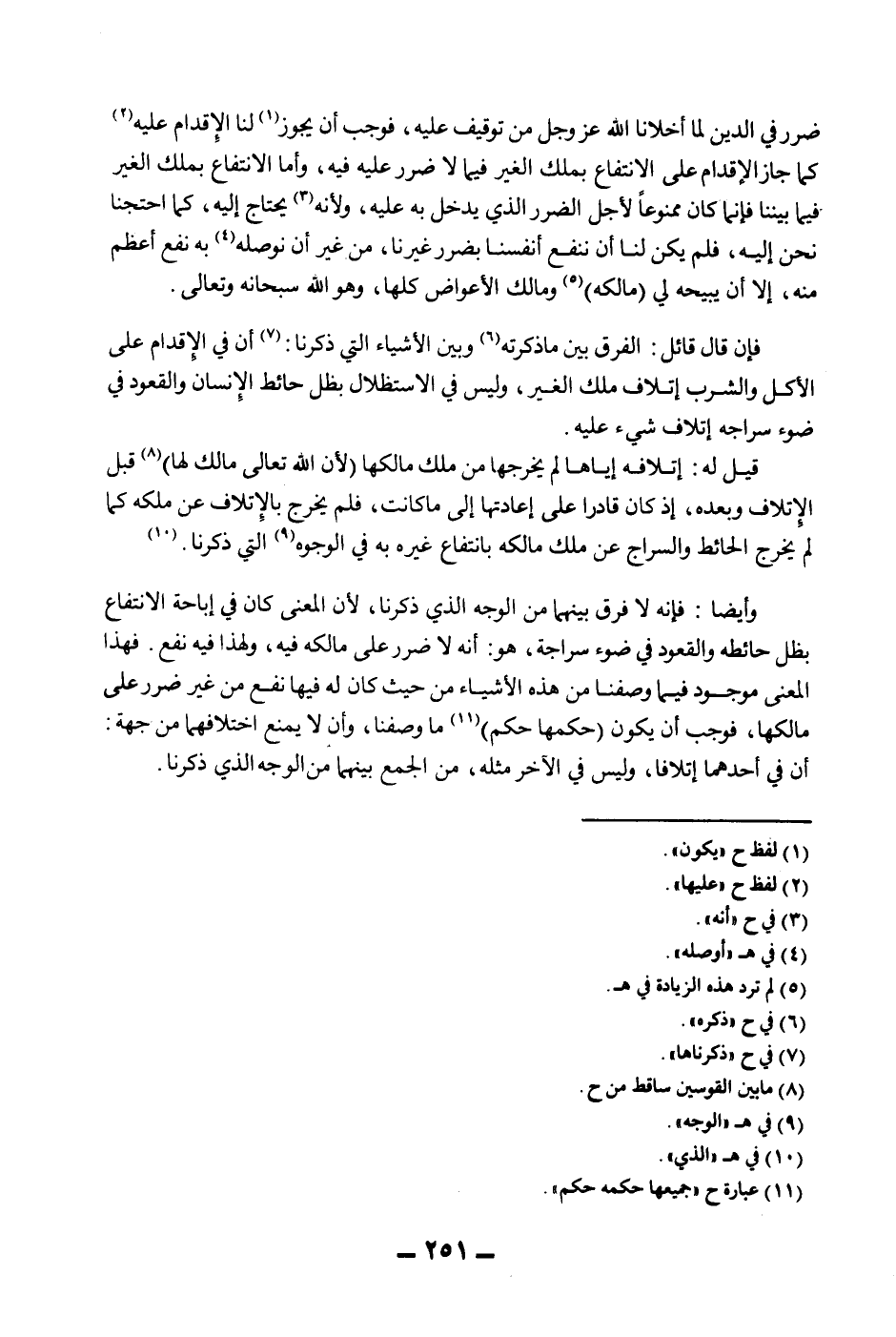 ضَرَرٌ فِي الدِّينِ لَمَا أَخْلَانَا اللَّهُ عَزَّ وَجَلَّ مِنْ تَوْقِيفٍ عَلَيْهِ، فَوَجَبَ أَنْ يَجُوزَ لَنَا الْإِقْدَامُ عَلَيْهِ كَمَا جَازَ الْإِقْدَامُ عَلَى الِانْتِفَاعِ بِمِلْكِ الْغَيْرِ فِيمَا لَا ضَرَرَ عَلَيْهِ فِيهِ، وَأَمَّا الِانْتِفَاعُ بِمِلْكِ الْغَيْرِ فِيمَا بَيْنَنَا فَإِنَّمَا كَانَ مَمْنُوعًا لِأَجْلِ الضَّرَرِ الَّذِي يَدْخُلُ بِهِ عَلَيْهِ، وَلِأَنَّهُ يَحْتَاجُ إلَيْهِ، كَمَا احْتَجْنَا نَحْنُ إلَيْهِ، فَلَمْ يَكُنْ لَنَا أَنْ نَنْفَعَ أَنْفُسَنَا بِضَرَرِ غَيْرِنَا، مِنْ غَيْرِ أَنْ نُوصِلَهُ بِهِ نَفْعًا أَعْظَمَ مِنْهُ، إلَّا أَنْ يُبِيحَهُ لِي (مَالِكُهُ) وَمَالِكُ الْأَعْوَاضِ كُلِّهَا، وَهُوَ اللَّهُ سُبْحَانَهُ وَتَعَالَى.