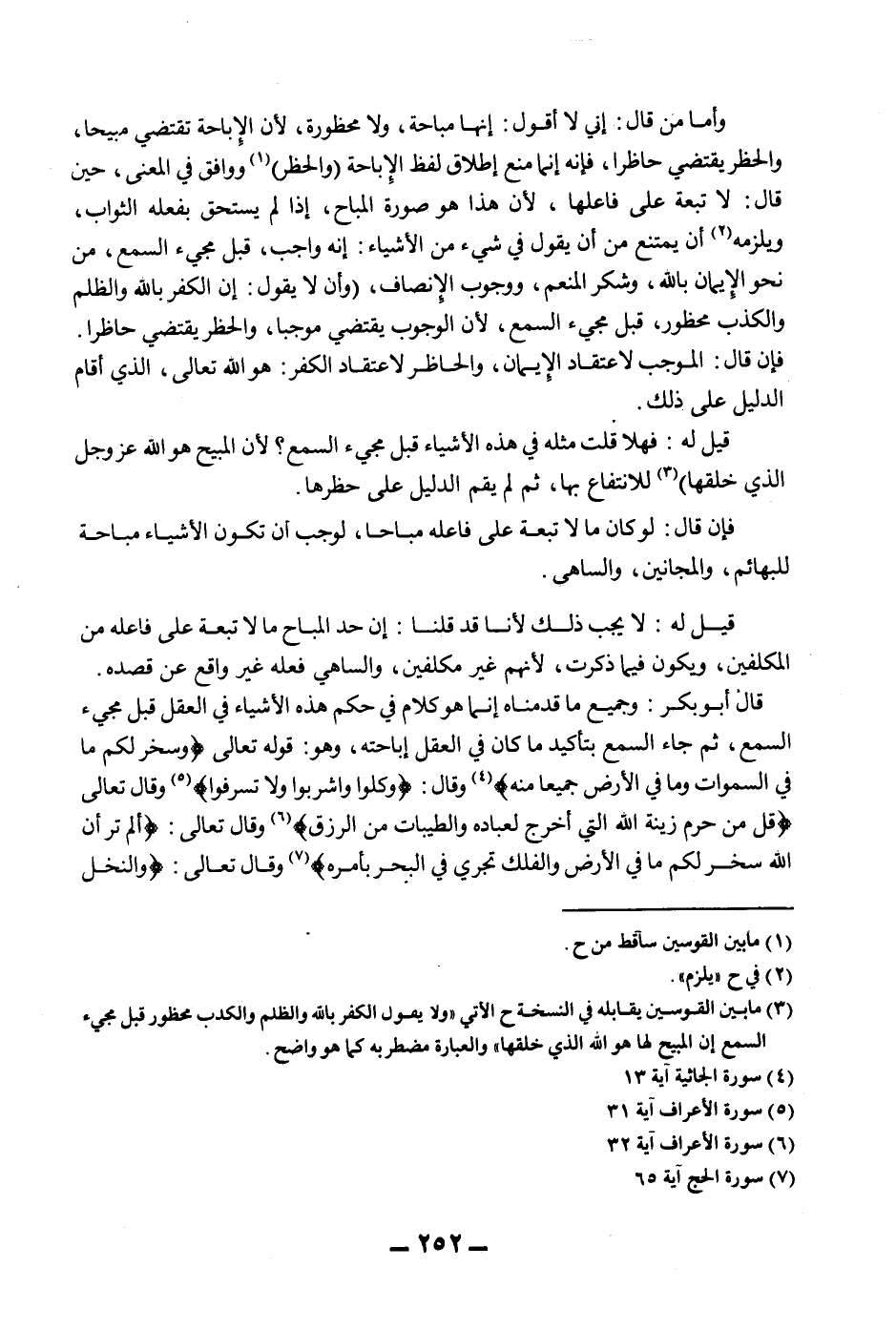 قَالَ أَبُو بَكْرٍ: وَجَمِيعُ مَا قَدَّمْنَاهُ إنَّمَا هُوَ كَلَامٌ فِي حُكْمِ هَذِهِ الْأَشْيَاءِ فِي الْعَقْلِ قَبْلَ مَجِيءِ السَّمْعِ، ثُمَّ جَاءَ السَّمْعُ بِتَأْكِيدِ مَا كَانَ فِي الْعَقْلِ إبَاحَتُهُ، وَهُوَ: قَوْله تَعَالَى {وَسَخَّرَ لَكُمْ مَا فِي السَّمَاوَاتِ وَمَا فِي الْأَرْضِ جَمِيعًا مِنْهُ} [الجاثية: 13] وَقَالَ: {وَكُلُوا وَاشْرَبُوا وَلَا تُسْرِفُوا} [الأعراف: 31] وَقَالَ تَعَالَى {قُلْ مَنْ حَرَّمَ زِينَةَ اللَّهِ الَّتِي أَخْرَجَ لِعِبَادِهِ وَالطَّيِّبَاتِ مِنْ الرِّزْقِ} [الأعراف: 32] وَقَالَ تَعَالَى: {أَلَمْ تَرَ أَنَّ اللَّهَ سَخَّرَ لَكُمْ مَا فِي الْأَرْضِ وَالْفُلْكَ تَجْرِي فِي الْبَحْرِ بِأَمْرِهِ} [الحج: 65] وَقَالَ تَعَالَى: