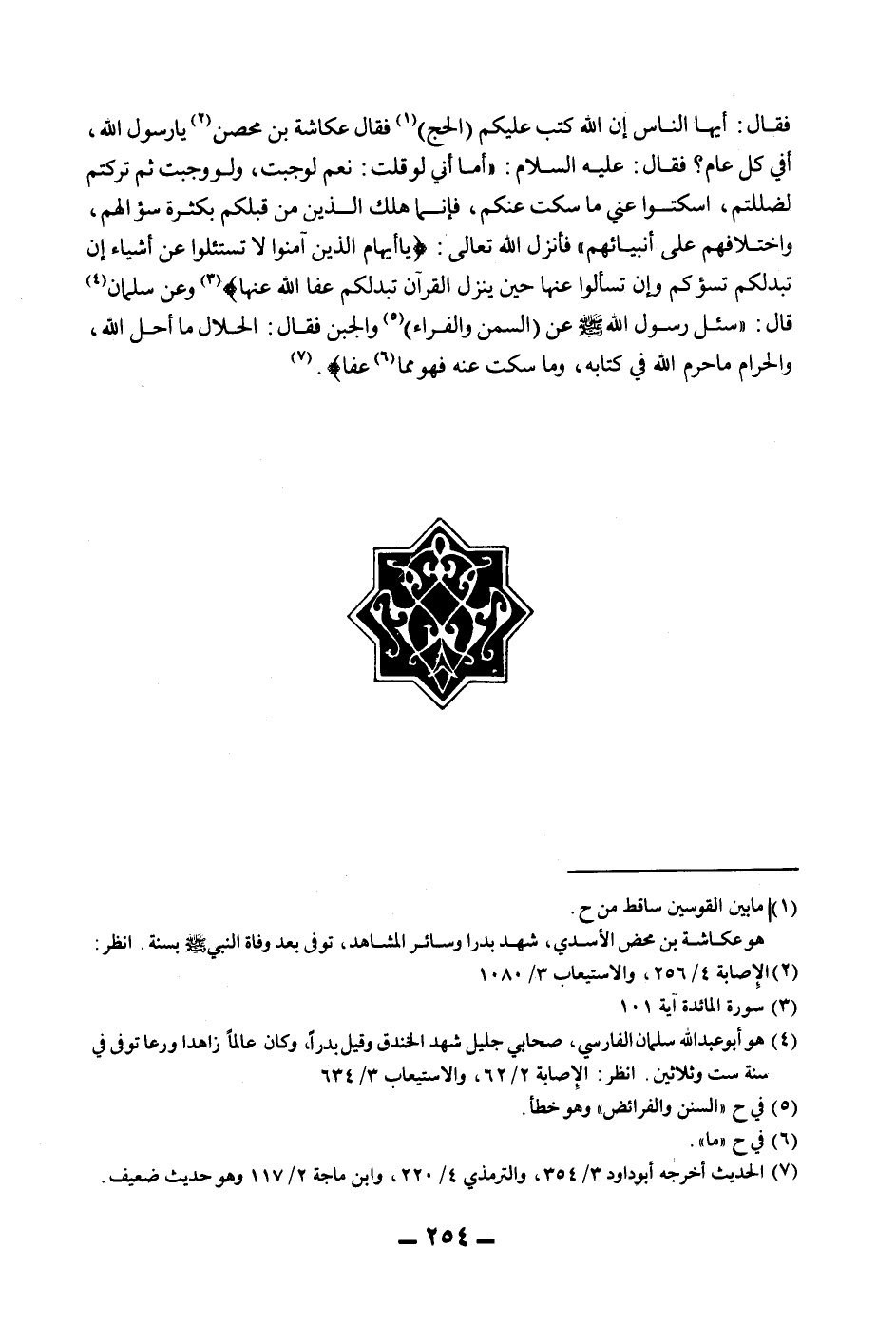 فَقَالَ: أَيُّهَا النَّاسُ إنَّ اللَّهَ كَتَبَ عَلَيْكُمْ الْحَجَّ فَقَالَ عُكَاشَةُ بْنُ مِحْصَنٍ يَا رَسُولَ اللَّهِ، أَفِي كُلِّ عَامٍ؟ فَقَالَ: - عَلَيْهِ السَّلَامُ -: أَمَا إنِّي لَوْ قُلْت: نَعَمْ لَوَجَبَتْ، وَلَوْ وَجَبَتْ ثُمَّ تَرَكْتُمْ لَضَلَلْتُمْ، اُسْكُتُوا عَنِّي مَا سَكَتُّ عَنْكُمْ، فَإِنَّمَا هَلَكَ الَّذِينَ مَنْ قَبْلَكُمْ بِكَثْرَةِ سُؤَالِهِمْ، وَاخْتِلَافِهِمْ عَلَى أَنْبِيَائِهِمْ فَأَنْزَلَ اللَّهُ تَعَالَى: {يَا أَيُّهَا الَّذِينَ آمَنُوا لَا تَسْأَلُوا عَنْ أَشْيَاءَ إنْ تُبْدَ لَكُمْ تَسُؤْكُمْ وَإِنْ تَسْأَلُوا عَنْهَا حِينَ يُنَزَّلُ الْقُرْآنُ تُبْدَ لَكُمْ عَفَا اللَّهُ عَنْهَا} [المائدة: 101] » وَعَنْ سَلْمَانَ قَالَ: «سُئِلَ رَسُولُ اللَّهِ - صَلَّى اللَّهُ عَلَيْهِ وَسَلَّمَ - عَنْ السَّمْنِ وَالْفِرَاءِ وَالْجُبْنِ فَقَالَ: الْحَلَالُ مَا أَحَلَّ اللَّهُ، وَالْحَرَامُ مَا حَرَّمَ اللَّهُ فِي كِتَابِهِ، وَمَا سَكَتَ عَنْهُ فَهُوَ مِمَّا عَفَا»