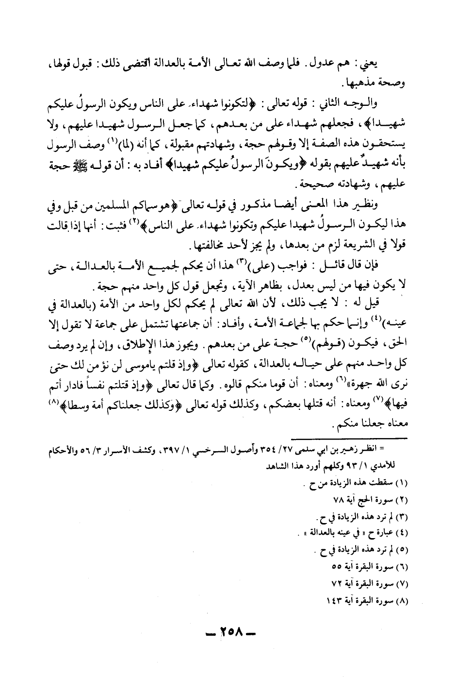 وَنَظِيرُ هَذَا الْمَعْنَى أَيْضًا مَذْكُورٌ فِي قَوْله تَعَالَى {هُوَ سَمَّاكُمْ الْمُسْلِمِينَ مِنْ قَبْلُ وَفِي هَذَا لِيَكُونَ الرَّسُولُ شَهِيدًا عَلَيْكُمْ وَتَكُونُوا شُهَدَاءَ عَلَى النَّاسِ} [الحج: 78] فَثَبَتَ: أَنَّهَا إذَا قَالَتْ قَوْلًا فِي الشَّرِيعَةِ لَزِمَ مَنْ بَعْدَهَا، وَلَمْ يَجُزْ لِأَحَدٍ مُخَالَفَتُهَا.