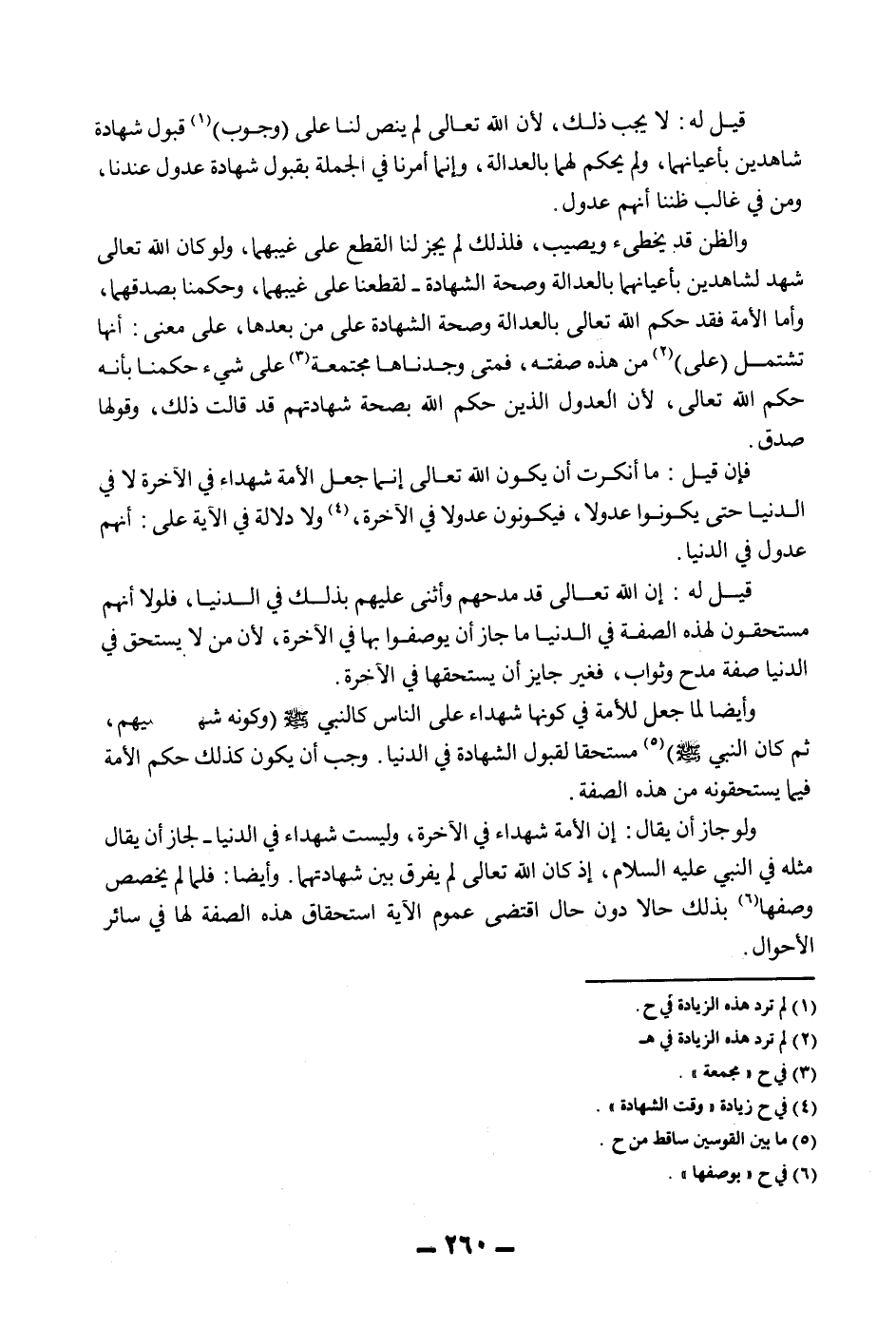 وَأَيْضًا لَمَّا جَعَلَ لِلْأُمَّةِ فِي كَوْنِهَا شُهَدَاءَ عَلَى النَّاسِ كَالنَّبِيِّ - صَلَّى اللَّهُ عَلَيْهِ وَسَلَّمَ - فِي (وَكَوْنِهِ شَهِيدًا عَلَيْهِمْ ثُمَّ كَانَ النَّبِيُّ - صَلَّى اللَّهُ عَلَيْهِ وَسَلَّمَ -) مُسْتَحِقًّا لِقَبُولِ الشَّهَادَةِ فِي الدُّنْيَا. وَجَبَ أَنْ يَكُونَ كَذَلِكَ حُكْمُ الْأُمَّةِ فِيمَا يَسْتَحِقُّونَهُ مِنْ هَذِهِ الصِّفَةِ.