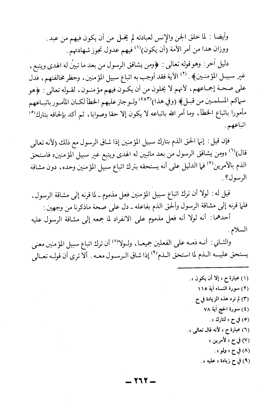 دَلِيلٌ آخَرُ: وَهُوَ قَوْله تَعَالَى: {وَمَنْ يُشَاقِقْ الرَّسُولَ مِنْ بَعْدِ مَا تَبَيَّنَ لَهُ الْهُدَى وَيَتَّبِعْ، غَيْرَ سَبِيلِ الْمُؤْمِنِينَ} [النساء: 115] الْآيَةَ فَقَدْ أَوْجَبَ بِهِ اتِّبَاعَ سَبِيلِ الْمُؤْمِنِينَ، وَحَظَرَ مُخَالَفَتَهُمْ، فَدَلَّ عَلَى صِحَّةِ إجْمَاعِهِمْ، لِأَنَّهُمْ لَا يَخْلُونَ مِنْ أَنْ يَكُونَ فِيهِمْ مُؤْمِنُونَ، لِقَوْلِهِ تَعَالَى: {هُوَ سَمَّاكُمْ الْمُسْلِمِينَ مِنْ قَبْلُ} [الحج: 78] (وَفِي هَذَا) وَلَوْ جَازَ عَلَيْهِمْ الْخَطَأُ لَكَانَ الْمَأْمُورُ بِاتِّبَاعِهِمْ مَأْمُورًا بِاتِّبَاعِ الْخَطَأِ، وَمَا أَمَرَ اللَّهُ بِاتِّبَاعِهِ لَا يَكُونُ إلَّا حَقًّا وَصَوَابًا، ثُمَّ أَكَّدَ بِإِلْحَاقِهِ بِتَارِكِ اتِّبَاعِهِمْ.
