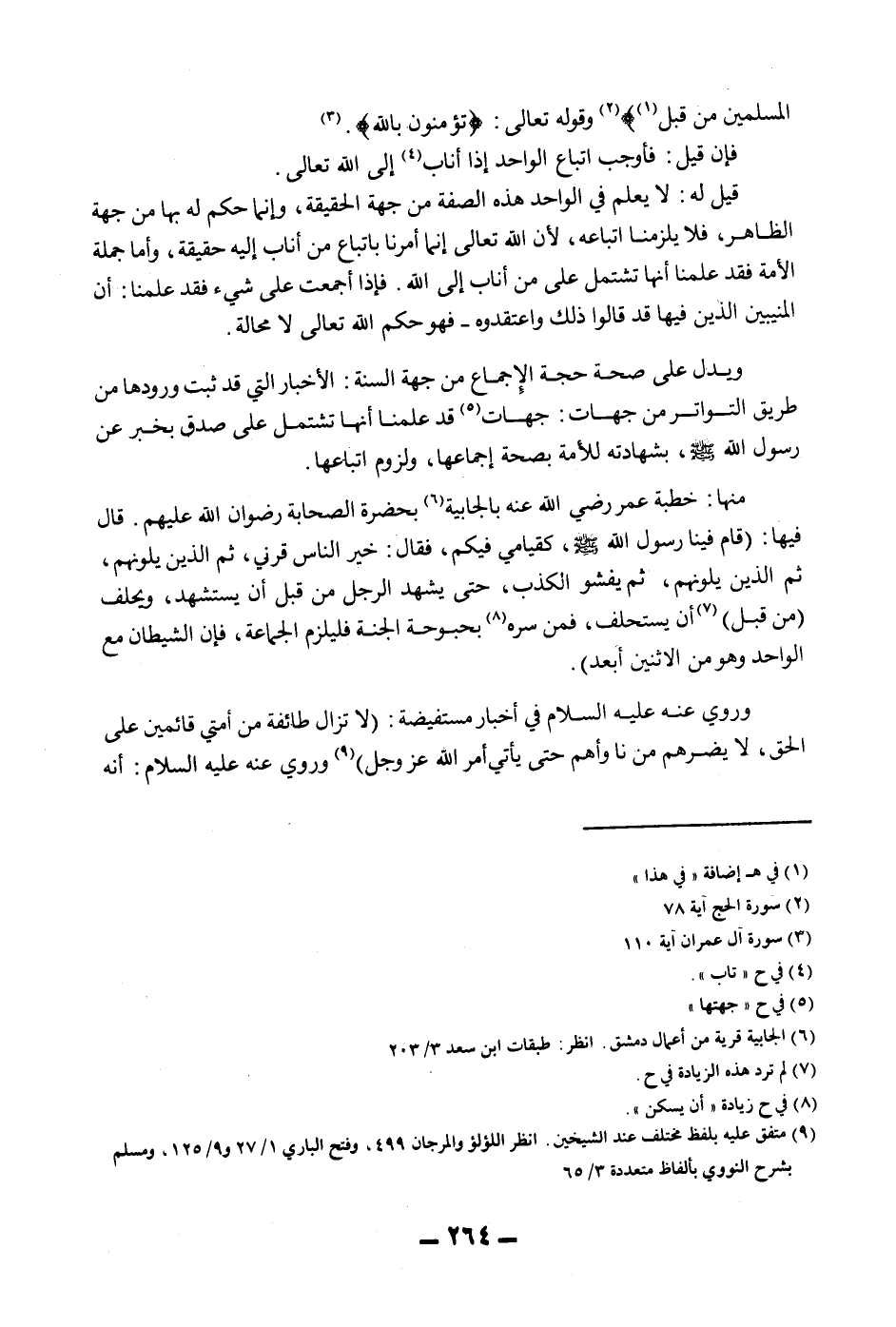 مِنْهَا: «خُطْبَةُ عُمَرَ - رَضِيَ اللَّهُ عَنْهُ - بِالْجَابِيَةِ بِحَضْرَةِ الصَّحَابَةِ - رِضْوَانُ اللَّهِ عَلَيْهِمْ -. قَالَ فِيهَا: قَامَ فِينَا رَسُولُ اللَّهِ - صَلَّى اللَّهُ عَلَيْهِ وَسَلَّمَ - كَقِيَامِي فِيكُمْ، فَقَالَ: خَيْرُ النَّاسِ قَرْنِي، ثُمَّ الَّذِينَ يَلُونَهُمْ، ثُمَّ الَّذِينَ يَلُونَهُمْ، ثُمَّ يَفْشُو الْكَذِبُ، حَتَّى يَشْهَدَ الرَّجُلُ مِنْ قَبْلِ أَنْ يُسْتَشْهَدَ، وَيَحْلِفَ مِنْ قَبْلِ أَنْ يُسْتَحْلَفَ، فَمَنْ سَرَّهُ بُحْبُوحَةُ الْجَنَّةِ فَلْيَلْزَمْ الْجَمَاعَةَ، فَإِنَّ الشَّيْطَانَ مَعَ الْوَاحِدِ وَهُوَ مَعَ الِاثْنَيْنِ أَبْعَدُ» .
