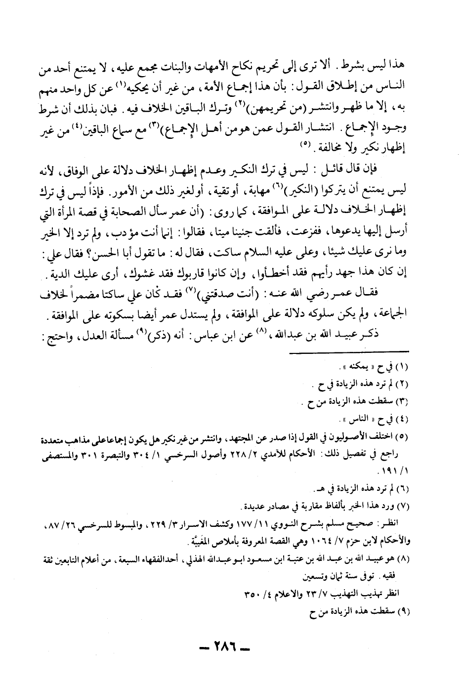هَذَا لَيْسَ بِشَرْطٍ. أَلَا تَرَى إلَى تَحْرِيمِ نِكَاحِ الْأُمَّهَاتِ وَالْبَنَاتِ مُجْمَعٌ عَلَيْهِ، لَا يَمْتَنِعُ أَحَدٌ مِنْ النَّاسِ مِنْ إطْلَاقِ الْقَوْلِ: بِأَنَّ هَذَا إجْمَاعُ الْأُمَّةِ، مِنْ غَيْرِ أَنْ يَحْكِيَهُ عَنْ كُلِّ وَاحِدٍ مِنْهُمْ بِهِ، إلَّا مَا ظَهَرَ وَانْتَشَرَ (مِنْ تَحْرِيمِهِنَّ) وَتَرْكِ الْبَاقِينَ الْخِلَافَ فِيهِ. فَبَانَ بِذَلِكَ أَنَّ شَرْطَ وُجُودِ الْإِجْمَاعِ. انْتِشَارُ الْقَوْلِ (عَمَّنْ هُوَ مِنْ أَهْلِ الْإِجْمَاعِ) مَعَ سَمَاعِ الْبَاقِينَ مِنْ غَيْرِ إظْهَارِ نَكِيرٍ وَلَا مُخَالَفَةٍ.