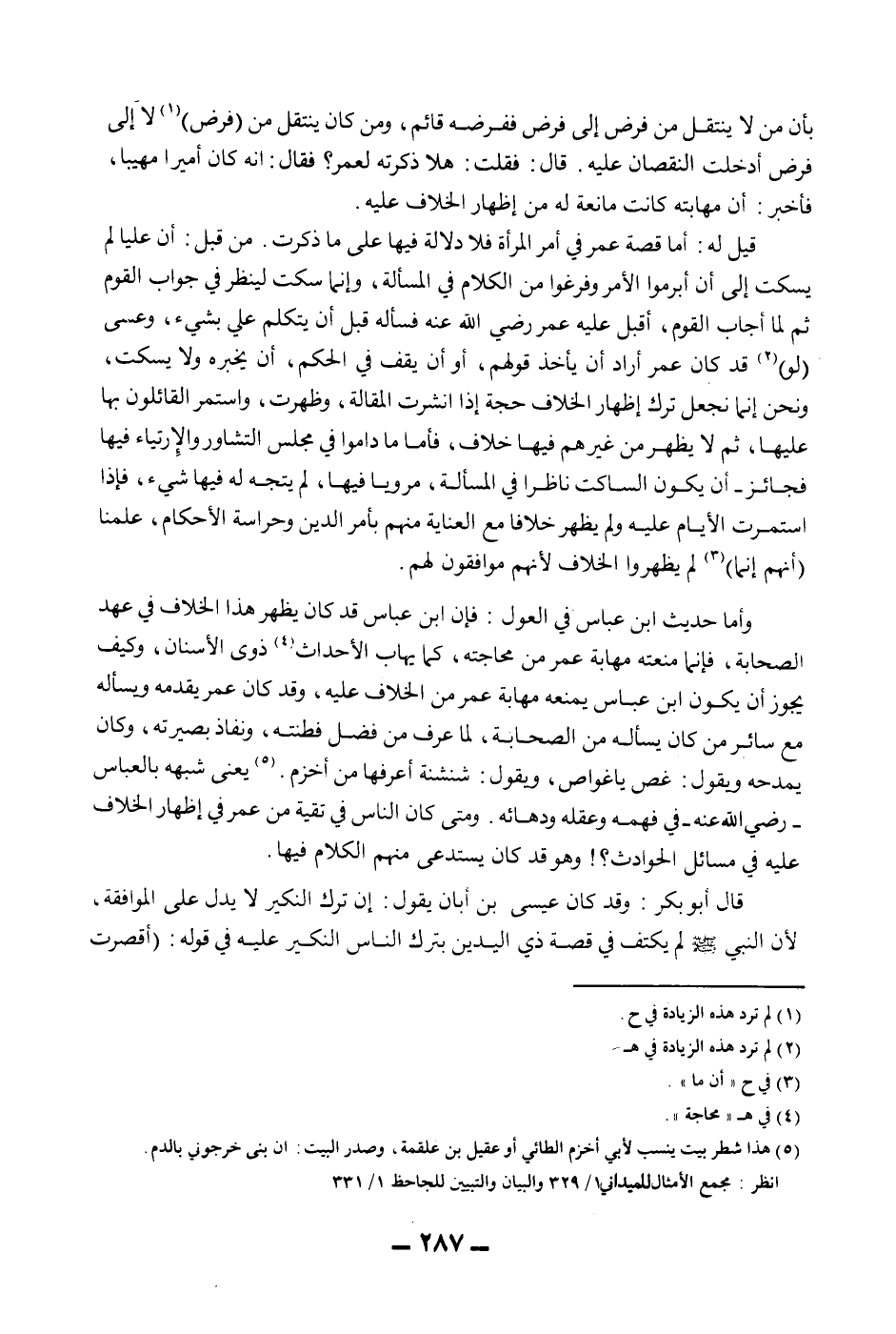وَأَمَّا حَدِيثُ ابْنِ عَبَّاسٍ فِي الْعَوْلِ: فَإِنَّ ابْنَ عَبَّاسٍ قَدْ كَانَ يُظْهِرُ هَذَا الْخِلَافَ فِي عَهْدِ الصَّحَابَةِ، فَإِنَّمَا مَنَعَتْهُ مَهَابَةُ عُمَرَ مِنْ مُحَاجَّتِهِ، كَمَا يَهَابُ الْأَحْدَاثُ ذَوِي الْأَسْنَانِ، وَكَيْفَ يَجُوزُ أَنْ يَكُونَ ابْنُ عَبَّاسٍ يَمْنَعُهُ مَهَابَةُ عُمَرَ مِنْ الْخِلَافِ عَلَيْهِ، وَقَدْ كَانَ عُمَرُ يُقَدِّمُهُ وَيَسْأَلُهُ مَعَ سَائِرِ مَنْ كَانَ يَسْأَلُهُ مِنْ الصَّحَابَةِ، لِمَا عُرِفَ مِنْ فَضْلِ فِطْنَتِهِ، وَنَفَاذِ بَصِيرَتِهِ، وَكَانَ يَمْدَحُهُ وَيَقُولُ: غُصْ يَا غَوَّاصُ، وَيَقُولُ: شَنْشَنَةٌ أَعْرِفُهَا مِنْ أَخْزَمَ. يَعْنِي شَبَّهَهُ بِالْعَبَّاسِ - رَضِيَ اللَّهُ عَنْهُ - فِي فَهْمِهِ وَعَقْلِهِ وَدَهَائِهِ. وَمَتَى كَانَ النَّاسُ فِي تَقِيَّةٍ مِنْ عُمَرَ فِي إظْهَارِ الْخِلَافِ عَلَيْهِ فِي مَسَائِلِ الْحَوَادِثِ؟ وَهُوَ قَدْ كَانَ يَسْتَدْعِي مِنْهُمْ الْكَلَامَ فِيهَا.