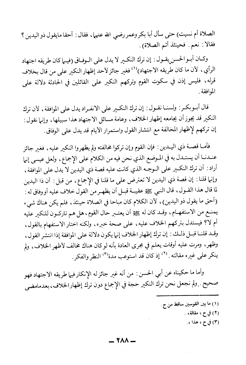 الصَّلَاةُ أَمْ نَسِيت حَتَّى سَأَلَ أَبَا بَكْرٍ وَعُمَرَ - رَضِيَ اللَّهُ عَنْهُمَا -، فَقَالَ: أَحَقٌّ مَا يَقُولُ ذُو الْيَدَيْنِ؟ فَقَالَا: نَعَمْ. فَحِينَئِذٍ أَتَمَّ الصَّلَاةَ» . وَكَانَ أَبُو الْحَسَنِ يَقُولُ: إنَّ تَرْكَ النَّكِيرِ لَا يَدُلُّ عَلَى الْوِفَاقِ (فِيمَا كَانَ طَرِيقُهُ اجْتِهَادَ الرَّأْيِ، لِأَنَّ مَا كَانَ طَرِيقُهُ الِاجْتِهَادَ) فَغَيْرُ جَائِزٍ لِأَحَدٍ إظْهَارُ النَّكِيرِ عَلَى مَنْ قَالَ بِخِلَافِ قَوْلِهِ، فَلَيْسَ إذَنْ فِي سُكُوتِ الْقَوْمِ وَتَرْكِهِمْ النَّكِيرَ عَلَى الْقَائِلِينَ فِي الْحَادِثَةِ دَلَالَةٌ عَلَى الْمُوَافَقَةِ.