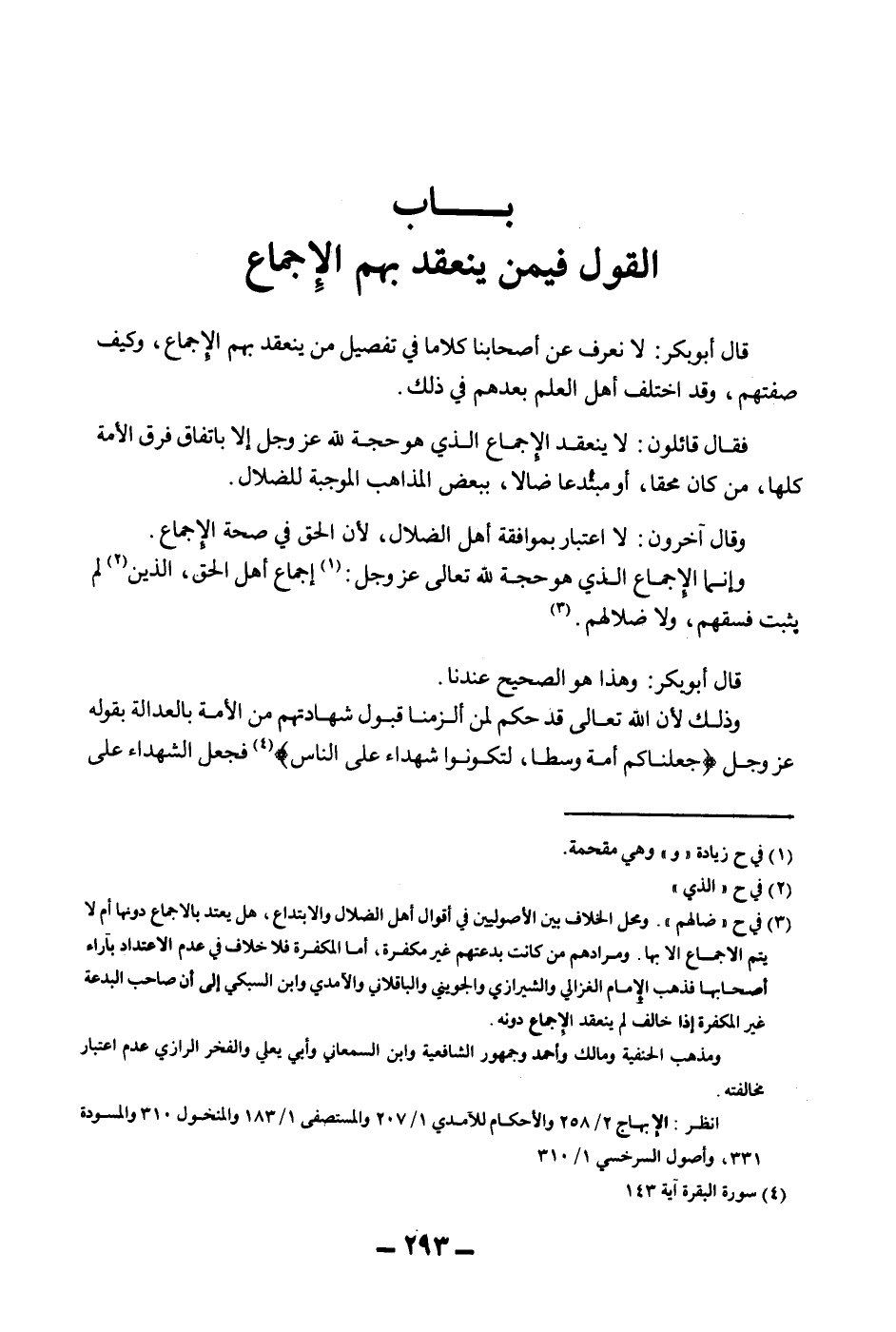ُ قَالَ أَبُو بَكْرٍ: لَا نَعْرِفُ عَنْ أَصْحَابِنَا كَلَامًا فِي تَفْصِيلِ مَنْ يَنْعَقِدُ بِهِمْ الْإِجْمَاعُ، وَكَيْفَ صِفَتُهُمْ، وَقَدْ اخْتَلَفَ أَهْلُ الْعِلْمِ بَعْدَهُمْ فِي ذَلِكَ.