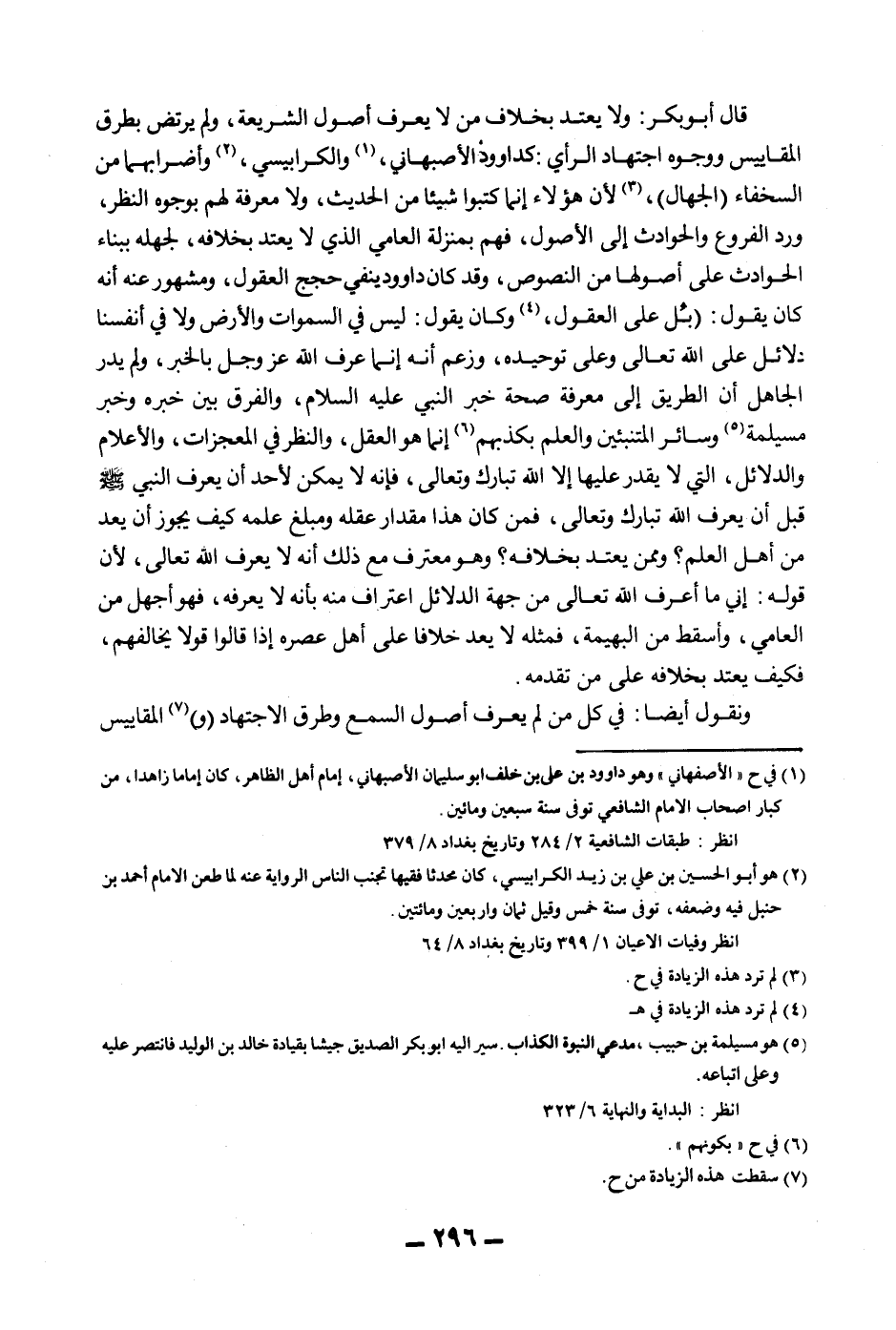 قَالَ أَبُو بَكْرٍ: وَلَا يُعْتَدُّ بِخِلَافِ مَنْ لَا يَعْرِفُ أُصُولَ الشَّرِيعَةِ، وَلَمْ يَرْتَضِ بِطُرُقِ الْمَقَايِيسِ وَوُجُوهِ اجْتِهَادِ الرَّأْيِ: كَدَاوُد الْأَصْبَهَانِيِّ وَالْكَرَابِيسِيِّ، وَأَضْرَابِهِمَا مِنْ السُّخَفَاءِ (الْجُهَّالِ) ، لِأَنَّ هَؤُلَاءِ إنَّمَا كَتَبُوا شَيْئًا مِنْ الْحَدِيثِ، وَلَا مَعْرِفَةَ لَهُمْ بِوُجُوهِ النَّظَرِ، وَرَدِّ الْفُرُوعِ وَالْحَوَادِثِ إلَى الْأُصُولِ، فَهُمْ بِمَنْزِلَةِ الْعَامِّيِّ الَّذِي لَا يُعْتَدُّ بِخِلَافِهِ، لِجَهْلِهِ بِبِنَاءِ الْحَوَادِثِ عَلَى أُصُولِهَا مِنْ النُّصُوصِ، وَقَدْ كَانَ دَاوُد يَنْفِي حُجَجَ الْعُقُولِ، وَمَشْهُورٌ عَنْهُ أَنَّهُ كَانَ يَقُولُ: (بَلْ عَلَى الْعُقُولِ) ، وَكَانَ يَقُولُ: لَيْسَ فِي السَّمَاوَاتِ وَالْأَرْضِ وَلَا فِي أَنْفُسِنَا دَلَائِلُ عَلَى اللَّهِ تَعَالَى وَعَلَى تَوْحِيدِهِ، وَزَعَمَ أَنَّهُ إنَّمَا عَرَفَ اللَّهَ عَزَّ وَجَلَّ بِالْخَبَرِ، وَلَمْ يَدْرِ الْجَاهِلُ أَنَّ الطَّرِيقَ إلَى مَعْرِفَةِ صِحَّةِ خَبَرِ النَّبِيِّ - عَلَيْهِ السَّلَامُ -، وَالْفَرْقِ بَيْنَ خَبَرِهِ وَخَبَرِ مُسَيْلِمَةَ وَسَائِرِ الْمُتَنَبِّئِينَ وَالْعِلْمِ بِكَذِبِهِمْ إنَّمَا هُوَ الْعَقْلُ، وَالنَّظَرُ فِي الْمُعْجِزَاتِ، وَالْأَعْلَامِ وَالدَّلَائِلِ، الَّتِي لَا يَقْدِرُ عَلَيْهَا إلَّا اللَّهُ تَبَارَكَ وَتَعَالَى، فَإِنَّهُ لَا يُمْكِنُ لِأَحَدٍ أَنْ يَعْرِفَ النَّبِيَّ - صَلَّى اللَّهُ عَلَيْهِ وَسَلَّمَ - قَبْلَ أَنْ يَعْرِفَ اللَّهَ تَبَارَكَ وَتَعَالَى، فَمَنْ كَانَ هَذَا مِقْدَارَ عَقْلِهِ وَمَبْلَغَ عِلْمِهِ كَيْفَ يَجُوزُ أَنْ يُعَدَّ مِنْ أَهْلِ الْعِلْمِ؟ وَمِمَّنْ يُعْتَدُّ بِخِلَافِهِ؟ وَهُوَ مُعْتَرِفٌ مَعَ ذَلِكَ أَنَّهُ لَا يَعْرِفُ اللَّهَ تَعَالَى، لِأَنَّ قَوْلَهُ: إنِّي مَا أَعْرِفُ اللَّهَ تَعَالَى مِنْ جِهَةِ الدَّلَائِلِ اعْتِرَافٌ مِنْهُ بِأَنَّهُ لَا يَعْرِفُهُ، فَهُوَ أَجْهَلُ مِنْ الْعَامِّيِّ، وَأَسْقَطَ مِنْ الْبَهِيمَةِ، فَمِثْلُهُ لَا يُعَدُّ خِلَافًا عَلَى أَهْلِ عَصْرِهِ إذَا قَالُوا قَوْلًا يُخَالِفُهُمْ، فَكَيْفَ يُعْتَدُّ بِخِلَافِهِ عَلَى مَنْ تَقَدَّمَهُ.