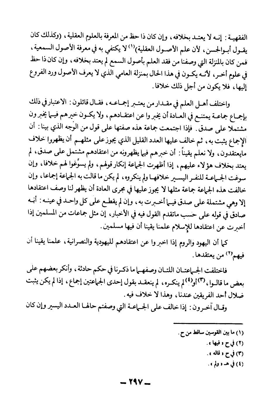 الْفِقْهِيَّةِ: إنَّهُ لَا يُعْتَدُّ بِخِلَافِهِ، وَإِنْ كَانَ ذَا حَظٍّ مِنْ الْمَعْرِفَةِ بِالْعُلُومِ الْعَقْلِيَّةِ، (وَكَذَلِكَ كَانَ يَقُولُ أَبُو الْحَسَنِ، لِأَنَّ عِلْمَ الْأُصُولِ الْعَقْلِيَّةِ) لَا يُكْتَفَى بِهِ فِي مَعْرِفَةِ الْأُصُولِ السَّمْعِيَّةِ، فَمَنْ كَانَ بِالْمَنْزِلَةِ الَّتِي وَصَفْنَا مِنْ فَقْدِ الْعِلْمِ بِأُصُولِ السَّمْعِ لَمْ يُعْتَدَّ بِخِلَافِهِ، وَإِنْ كَانَ ذَا حَظٍّ فِي عُلُومٍ أُخَرَ، لِأَنَّهُ يَكُونُ فِي هَذَا الْحَالِ بِمَنْزِلَةِ الْعَامِّيِّ الَّذِي لَا يَعْرِفُ الْأُصُولَ وَرَدَّ الْفُرُوعِ إلَيْهَا، فَلَا يَكُونُ مِنْ أَجْلِ ذَلِكَ خِلَافًا.