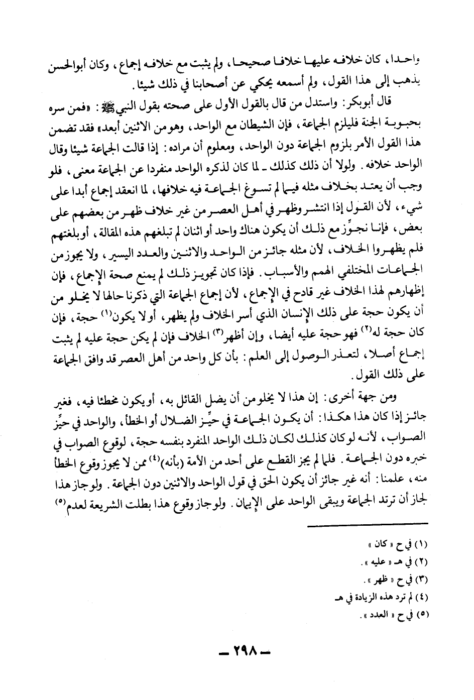 فَلَمَّا لَمْ يَجُزْ الْقَطْعُ عَلَى أَحَدٍ مِنْ الْأُمَّةِ (بِأَنَّهُ) مِمَّنْ لَا يَجُوزُ وُقُوعُ الْخَطَأِ مِنْهُ، عَلِمْنَا: أَنَّهُ غَيْرُ جَائِزٍ أَنْ يَكُونَ الْحَقُّ فِي قَوْلِ الْوَاحِدِ وَالِاثْنَيْنِ دُونَ الْجَمَاعَةِ. وَلَوْ جَازَ هَذَا لَجَازَ أَنْ تَرْتَدَّ الْجَمَاعَةُ وَيَبْقَى الْوَاحِدُ عَلَى الْإِيمَانِ. وَلَوْ جَازَ وُقُوعُ هَذَا بَطَلَتْ الشَّرِيعَةُ لِعَدَمِ