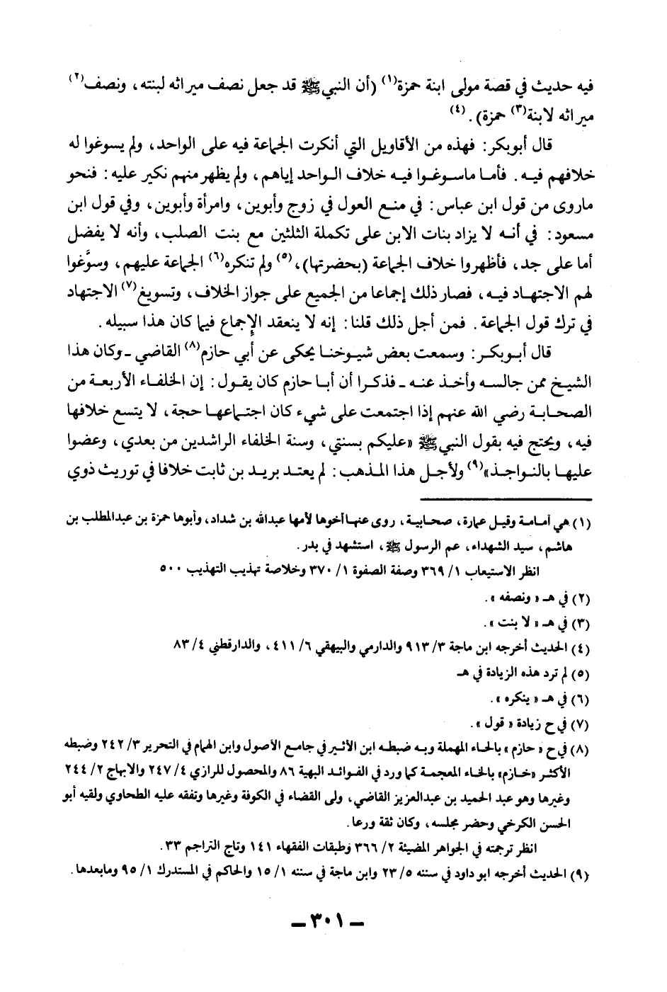 فِيهِ حَدِيثٌ «فِي قِصَّةِ مَوْلَى ابْنَةِ حَمْزَةَ أَنَّ النَّبِيَّ - صَلَّى اللَّهُ عَلَيْهِ وَسَلَّمَ - قَدْ جَعَلَ نِصْفَ مِيرَاثِهِ لِبِنْتِهِ، وَنِصْفَ مِيرَاثِهِ لِابْنَةِ حَمْزَةَ» .