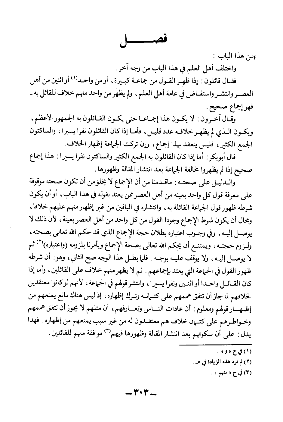 [فَصْلٌ ظَهَرَ الْقَوْلُ مِنْ جَمَاعَةٍ كَبِيرَةٍ أَوْ مِنْ وَاحِدٍ أَوْ اثْنَيْنِ مِنْ أَهْلِ الْعَصْرِ وَلَمْ يَظْهَرْ مِنْ وَاحِدٍ مِنْهُمْ خِلَافٌ لِلْقَائِلِ بِالْإِجْمَاعِ]