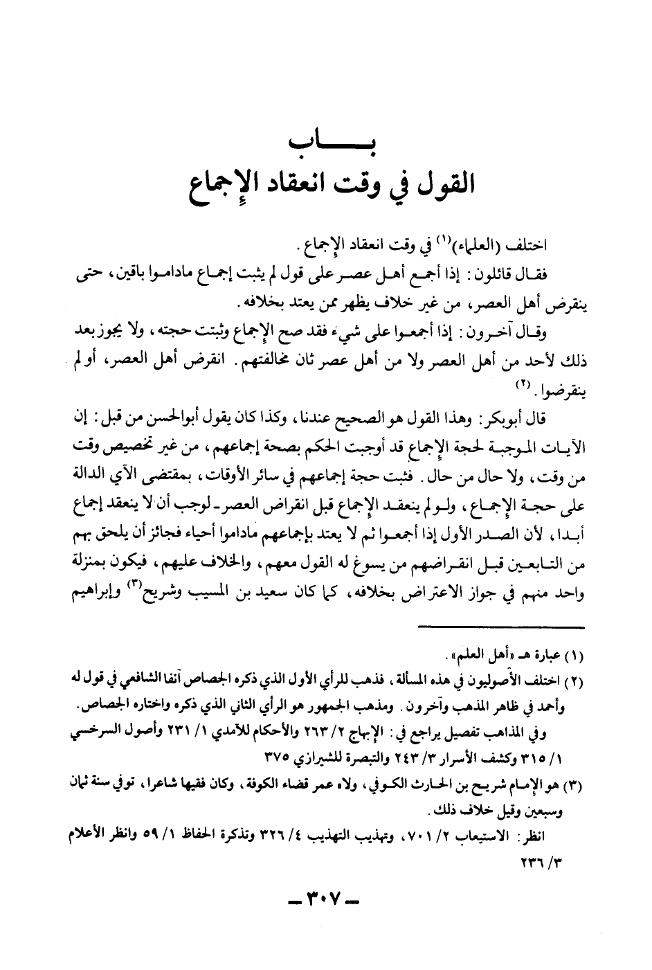 قَالَ أَبُو بَكْرٍ: وَهَذَا الْقَوْلُ هُوَ الصَّحِيحُ عِنْدَنَا، وَكَذَا كَانَ يَقُولُ أَبُو الْحَسَنِ مِنْ قِبَلُ: إنَّ الْآيَاتِ الْمُوجِبَةَ لِحُجَّةِ الْإِجْمَاعِ قَدْ أَوْجَبَتْ الْحُكْمَ بِصِحَّةِ إجْمَاعِهِمْ، مِنْ غَيْرِ تَخْصِيصِ وَقْتٍ مِنْ وَقْتٍ، وَلَا حَالٍ مِنْ حَالٍ. فَثَبَتَ حُجَّةُ إجْمَاعِهِمْ فِي سَائِرِ الْأَوْقَاتِ، بِمُقْتَضَى الْآيِ الدَّالَّةِ عَلَى حُجَّةِ الْإِجْمَاعِ، وَلَوْ لَمْ يَنْعَقِدْ الْإِجْمَاعُ قَبْلَ انْقِرَاضِ الْعَصْرِ - لَوَجَبَ أَنْ لَا يَنْعَقِدَ إجْمَاعٌ أَبَدًا، لِأَنَّ الصَّدْرَ الْأَوَّلَ إذَا أَجْمَعُوا ثُمَّ لَا يُعْتَدُّ بِإِجْمَاعِهِمْ مَا دَامُوا أَحْيَاءَ فَجَائِزٌ أَنْ يُلْحَقَ بِهِمْ مِنْ التَّابِعِينَ قَبْلَ انْقِرَاضِهِمْ مَنْ يُسَوَّغُ لَهُ الْقَوْلُ مَعَهُمْ، وَالْخِلَافُ عَلَيْهِمْ، فَيَكُونُ بِمَنْزِلَةِ وَاحِدٍ مِنْهُمْ فِي جَوَازِ الِاعْتِرَاضِ بِخِلَافِهِ، كَمَا كَانَ سَعِيدُ بْنُ الْمُسَيِّبِ وَشُرَيْحٌ وَإِبْرَاهِيمُ
