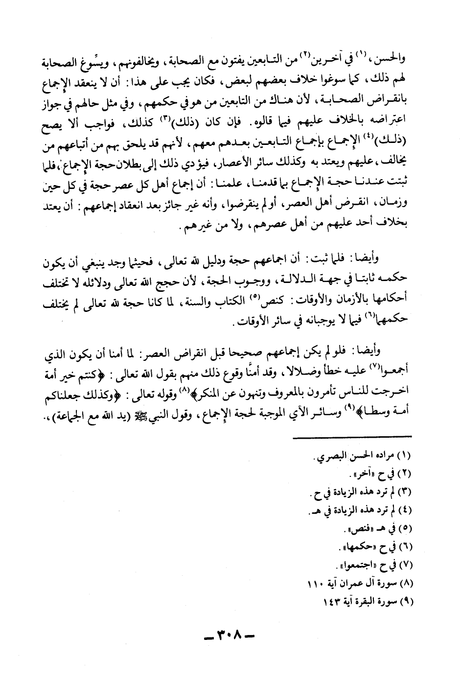 وَأَيْضًا: فَلَمَّا ثَبَتَ: أَنَّ إجْمَاعَهُمْ حُجَّةٌ وَدَلِيلٌ لِلَّهِ تَعَالَى، فَحَيْثُمَا وُجِدَ يَنْبَغِي أَنْ يَكُونَ حُكْمُهُ ثَابِتًا فِي جِهَةِ الدَّلَالَةِ، وَوُجُوبِ الْحُجَّةِ، لِأَنَّ حُجَجَ اللَّهِ تَعَالَى وَدَلَائِلَهُ لَا تَخْتَلِفُ أَحْكَامُهَا بِالْأَزْمَانِ وَالْأَوْقَاتِ: كَنَصِّ الْكِتَابِ وَالسُّنَّةِ، لَمَّا كَانَا حُجَّةً لِلَّهِ تَعَالَى لَمْ يَخْتَلِفْ حُكْمُهُمَا فِيمَا لَا يُوجِبَانِهِ فِي سَائِرِ الْأَوْقَاتِ.