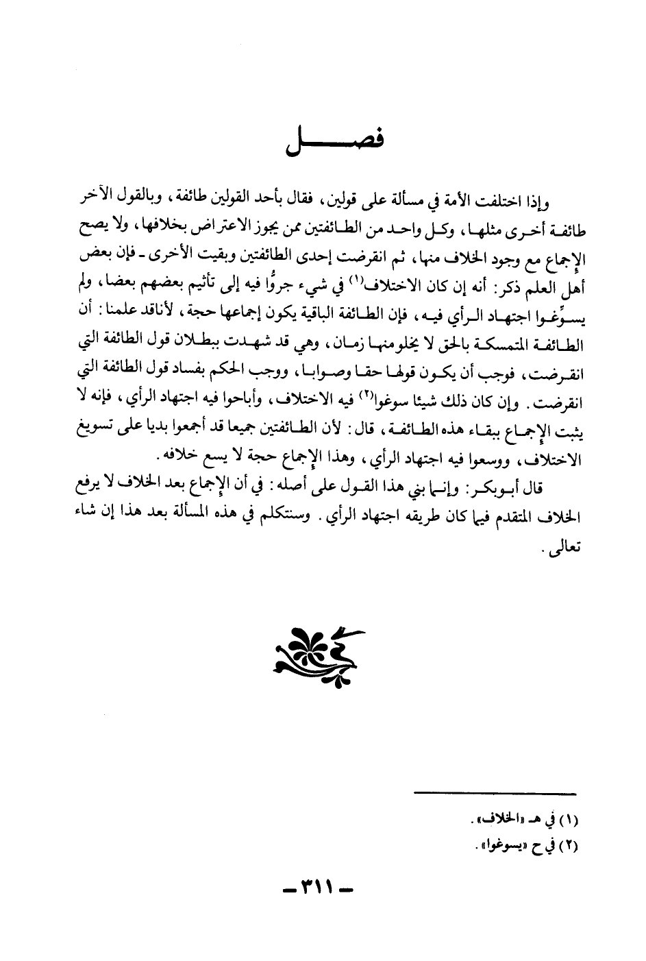 وَإِنْ كَانَ ذَلِكَ شَيْئًا سَوَّغُوا فِيهِ الِاخْتِلَافَ، وَأَبَاحُوا فِيهِ اجْتِهَادَ الرَّأْيِ، فَإِنَّهُ لَا يَثْبُتُ الْإِجْمَاعُ بِبَقَاءِ هَذِهِ الطَّائِفَةِ، قَالَ: لِأَنَّ الطَّائِفَتَيْنِ جَمِيعًا قَدْ أَجْمَعُوا بَدِيًّا عَلَى تَسْوِيغِ الِاخْتِلَافِ، وَوَسَّعُوا فِيهِ اجْتِهَادَ الرَّأْيِ، وَهَذَا الْإِجْمَاعُ حُجَّةٌ لَا يَسَعُ خِلَافُهُ.