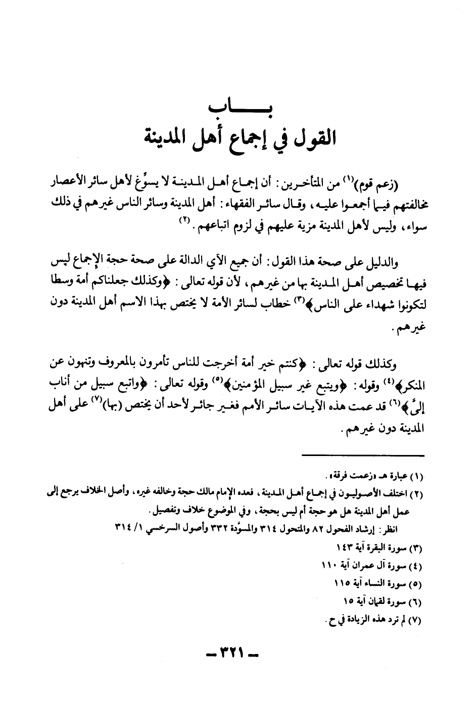 ِ (زَعَمَ قَوْمٌ) مِنْ الْمُتَأَخِّرِينَ: أَنَّ إجْمَاعَ أَهْلِ الْمَدِينَةِ لَا يُسَوِّغُ لِأَهْلِ سَائِرِ الْأَعْصَارِ مُخَالَفَتَهُمْ فِيمَا أَجْمَعُوا عَلَيْهِ، وَقَالَ سَائِرُ الْفُقَهَاءِ: أَهْلِ الْمَدِينَةِ وَسَائِرُ النَّاسِ غَيْرُهُمْ فِي ذَلِكَ سَوَاءٌ، وَلَيْسَ لِأَهْلِ الْمَدِينَةِ مَزِيَّةٌ عَلَيْهِمْ فِي لُزُومِ اتِّبَاعِهِمْ.