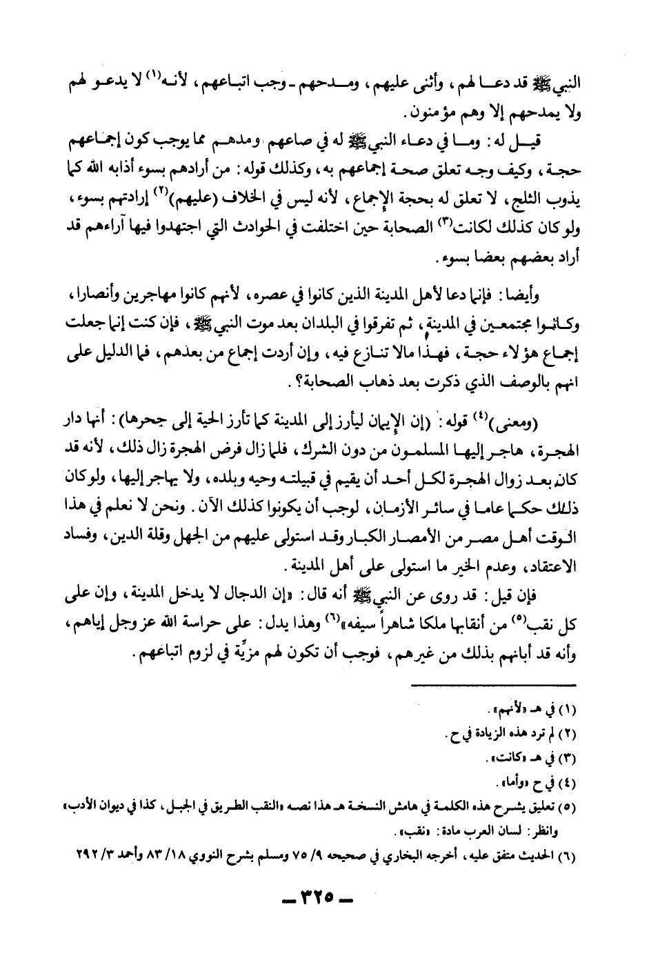 وَأَيْضًا: فَإِنَّمَا دَعَا لِأَهْلِ الْمَدِينَةِ الَّذِينَ كَانُوا فِي عَصْرِهِ، لِأَنَّهُمْ كَانُوا مُهَاجِرِينَ وَأَنْصَارًا، وَكَانُوا مُجْتَمِعِينَ فِي الْمَدِينَةِ، ثُمَّ تَفَرَّقُوا فِي الْبُلْدَانِ بَعْدَ مَوْتِ النَّبِيِّ - صَلَّى اللَّهُ عَلَيْهِ وَسَلَّمَ - فَإِنْ كُنْت إنَّمَا جَعَلْت إجْمَاعَ هَؤُلَاءِ حُجَّةً، فَهَذَا مَا لَا تَنَازُعَ فِيهِ، وَإِنْ أَرَدْت إجْمَاعَ مَنْ بَعْدَهُمْ، فَمَا الدَّلِيلُ عَلَى أَنَّهُمْ بِالْوَصْفِ الَّذِي ذَكَرْت بَعْدَ ذَهَابِ الصَّحَابَةِ؟ .