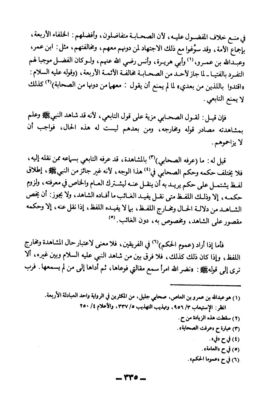 قِيلَ لَهُ: مَا (عَرَفَهُ الصَّحَابِيُّ) بِالْمُشَاهَدَةِ، قَدْ عَرَفَهُ التَّابِعِيُّ بِسَمَاعِهِ مِمَّنْ نَقَلَهُ إلَيْهِ، فَلَا يَخْتَلِفُ حُكْمُهُ وَحُكْمُ الصَّحَابِيِّ فِي هَذَا الْوَجْهِ، لِأَنَّهُ غَيْرُ جَائِزٍ مِنْ النَّبِيِّ - صَلَّى اللَّهُ عَلَيْهِ وَسَلَّمَ - فِي، إطْلَاقِ لَفْظٍ يَشْتَمِلُ عَلَى حُكْمٍ يُرِيدُ بِهِ أَنْ يَنْقُلَ عَنْهُ لِيَشْتَرِكَ الْعَامُّ وَالْخَاصُّ فِي مَعْرِفَتِهِ، وَلُزُومِ حُكْمِهِ، إلَّا وَذَلِكَ اللَّفْظُ مَتَى نُقِلَ يُفِيدُ الْغَائِبَ مَا أَفَادَهُ الشَّاهِدُ، وَلَا يَجُوزُ: أَنْ يُخَصَّ الشَّاهِدُ مِنْ دَلَالَةِ الْحَالِ وَمَخَارِجِ اللَّفْظِ، بِمَا لَا يُفِيدُهُ اللَّفْظُ، إذَا نُقِلَ عَنْهُ، إلَّا وَحُكْمُهُ مَقْصُورٌ عَلَى الشَّاهِدِ، وَمَخْصُوصٌ بِهِ، دُونَ الْغَائِبِ.